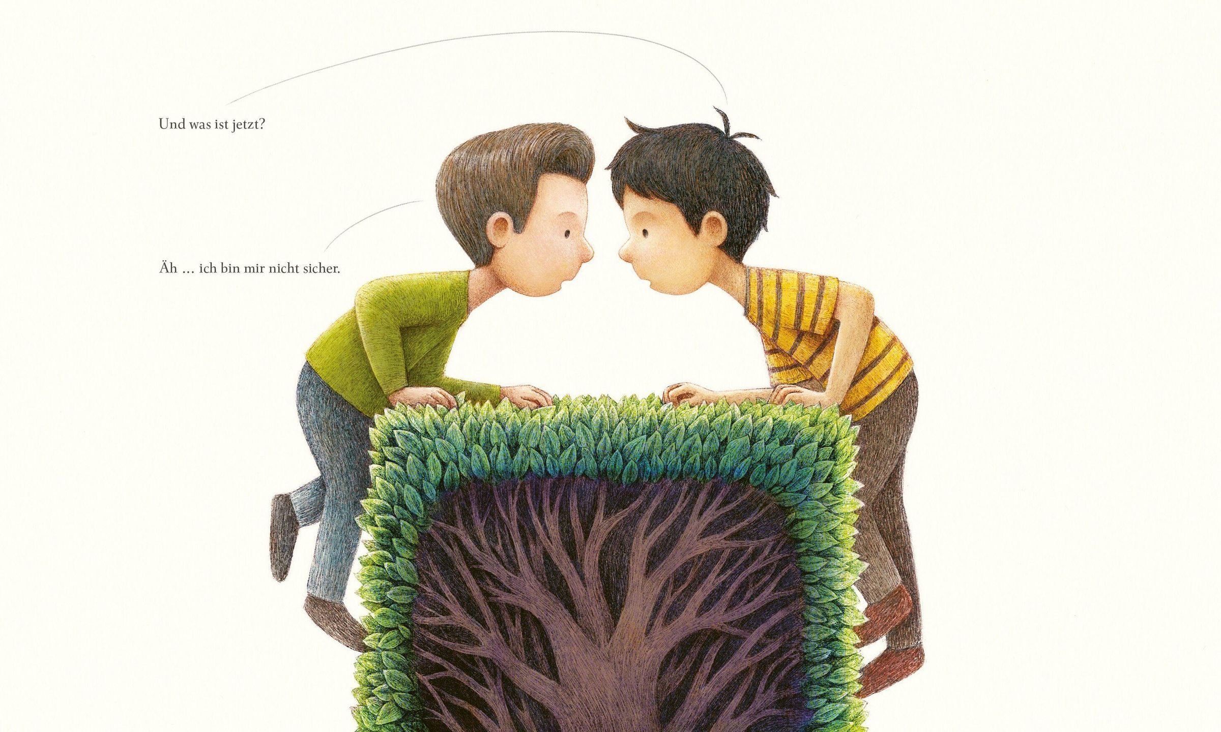 Zwei Kinder stehen an einer hohen Hecke und sprechen über die Menschen auf der anderen Seite.