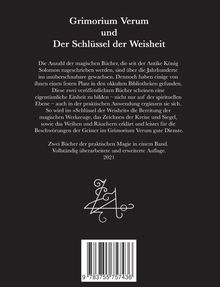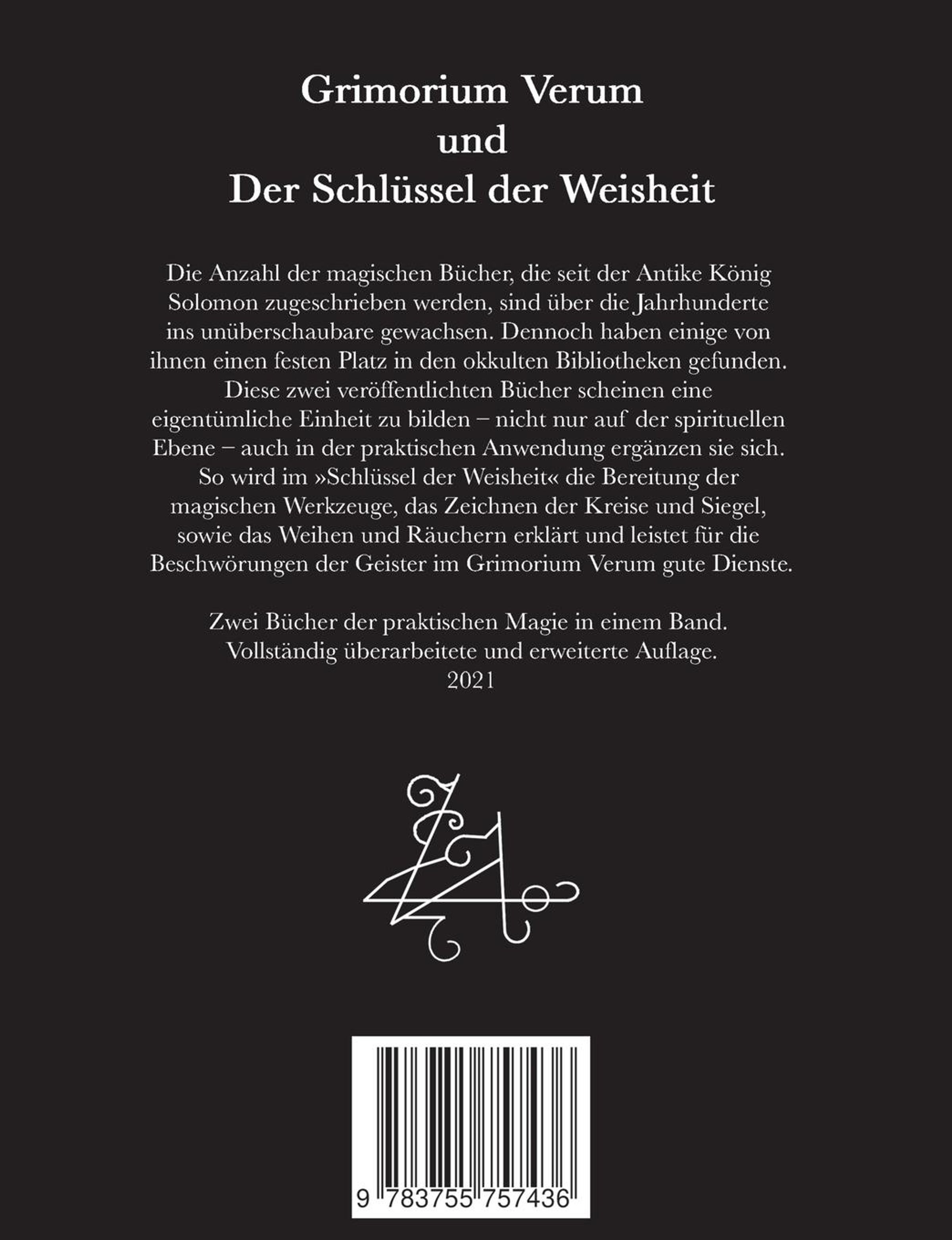 Die magischen Bücher, die seit der Antike König Solomon zugeschrieben werden, sind über die Jahrhunderte ins unüberschaubare gewachsen. Dennoch haben einige von ihnen einen festen Platz in den okkulten Bibliotheken gefunden. Diese beiden hier veröffentlichten Bücher scheinen eine eigentümliche Einheit zu bilden - nicht nur auf der spirituellen Ebene - auch in der praktischen Anwendung ergänzen sie sich. So wird im >>Schlüssel der Weisheit<< die Bereitung der magischen Werkzeuge, das Zeichnen der Kreise und Siegel, sowie das Weihen und Räuchern erklärt und leistet für die Beschwörungen der Geister im Grimoirium Verum gute Dienste.