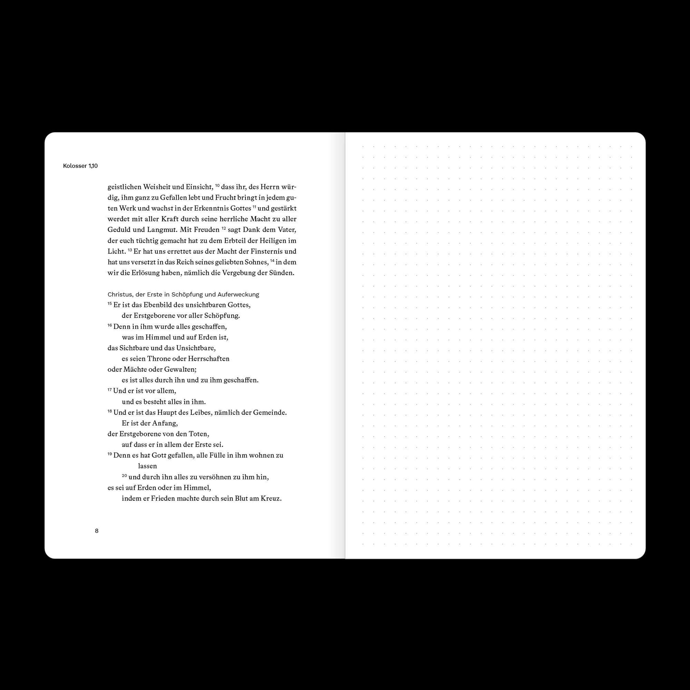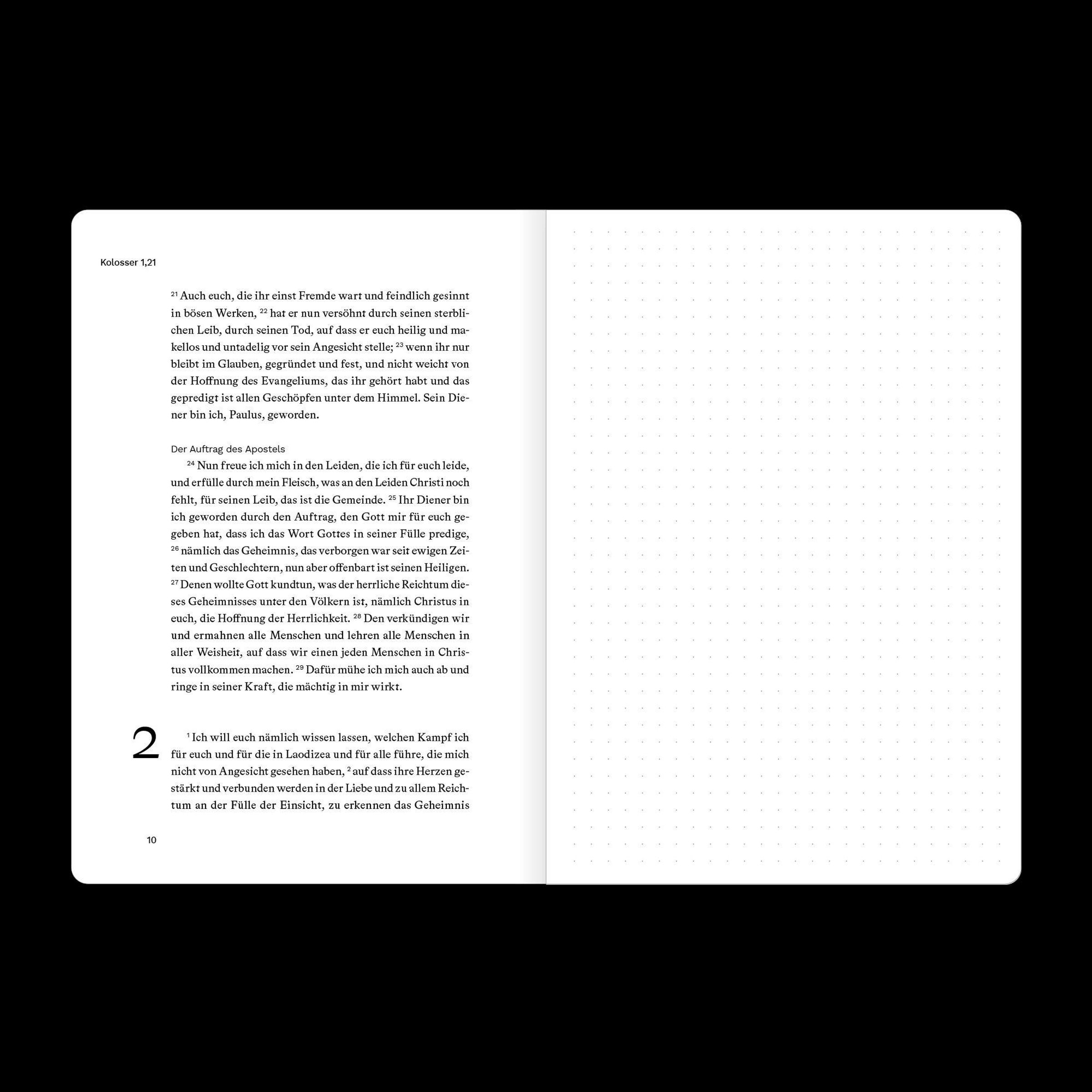 Dieses Bibeljournal kombiniert den vollständigen Bibeltext eines biblischen Buches (Luther 2017) und eine gegenüberliegende Seite mit dezentem Punktraster für deine persönlichen Notizen, Gedanken oder Gebete. So kannst du direkt neben dem Text festhalten, was dich beim Lesen bewegt.
