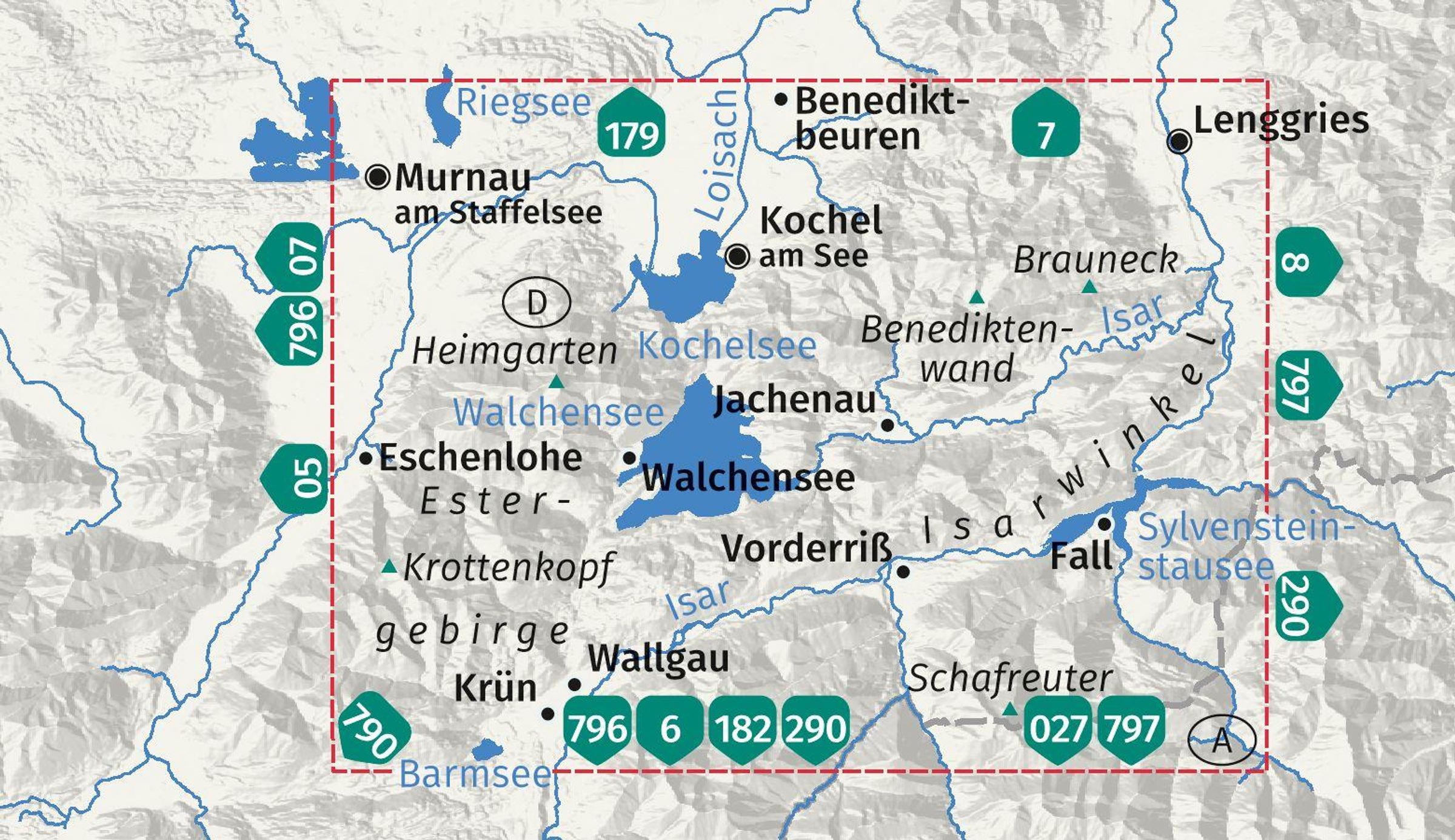Ausstattung der Wanderkarte Walchensee, Kochelsee, Sylvensteinstausee:
