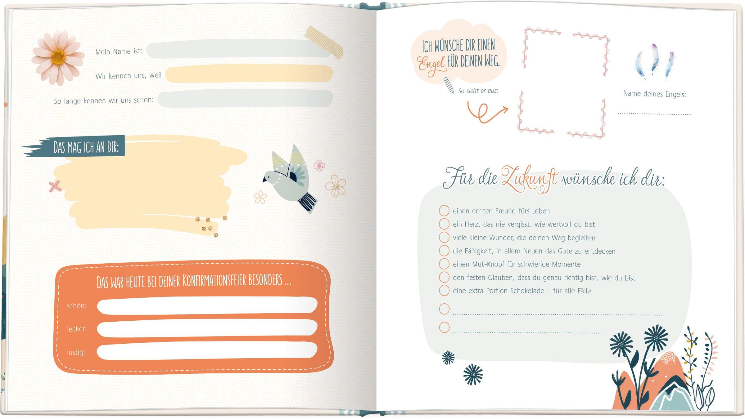 Ob schreiben, ankreuzen, einkreisen, malen oder einfach nur einen Fingerabdruck hinterlassen - dieses Buch lädt alle Gäste ein, sich auf kreative Art und Weise zu verewigen. Dank vorgefertigter Fragen und verspielten Gestaltungselementen können die Gäste während der Feier schnell und einfach ihre lieben Wünsche und Botschaften für die Konfirmandin eintragen.
