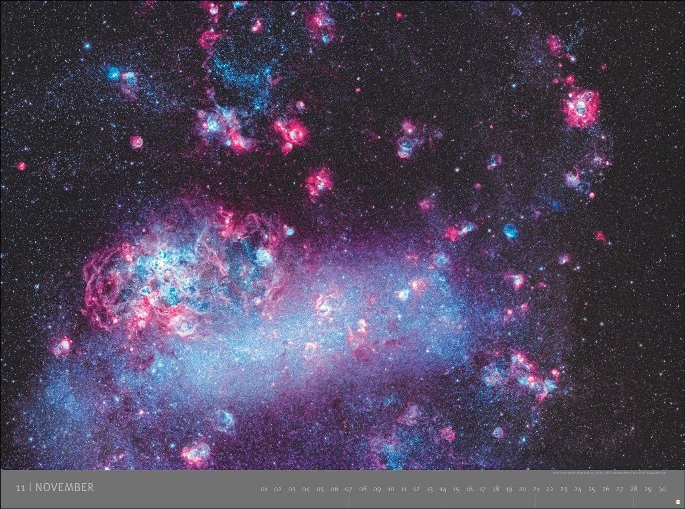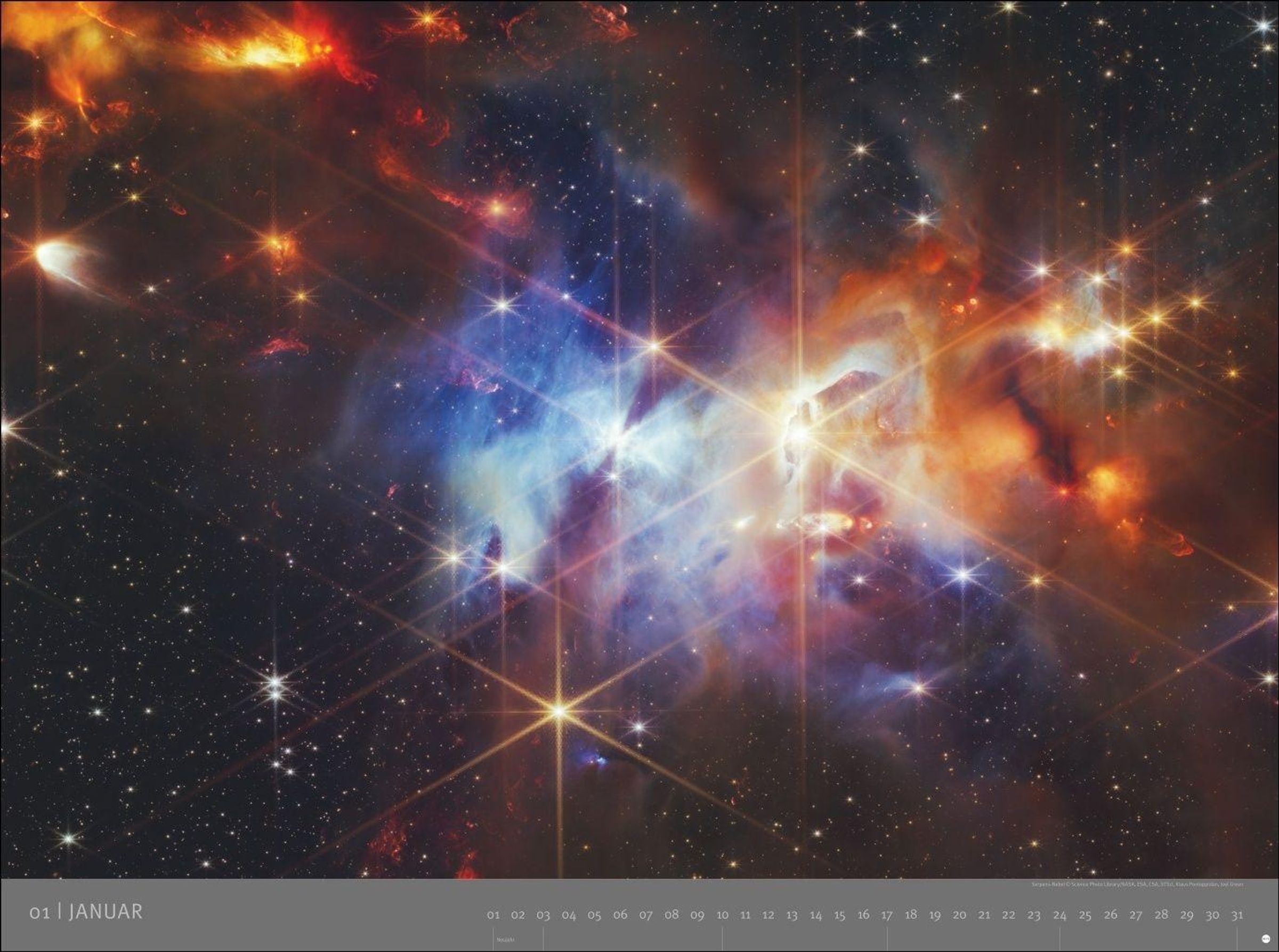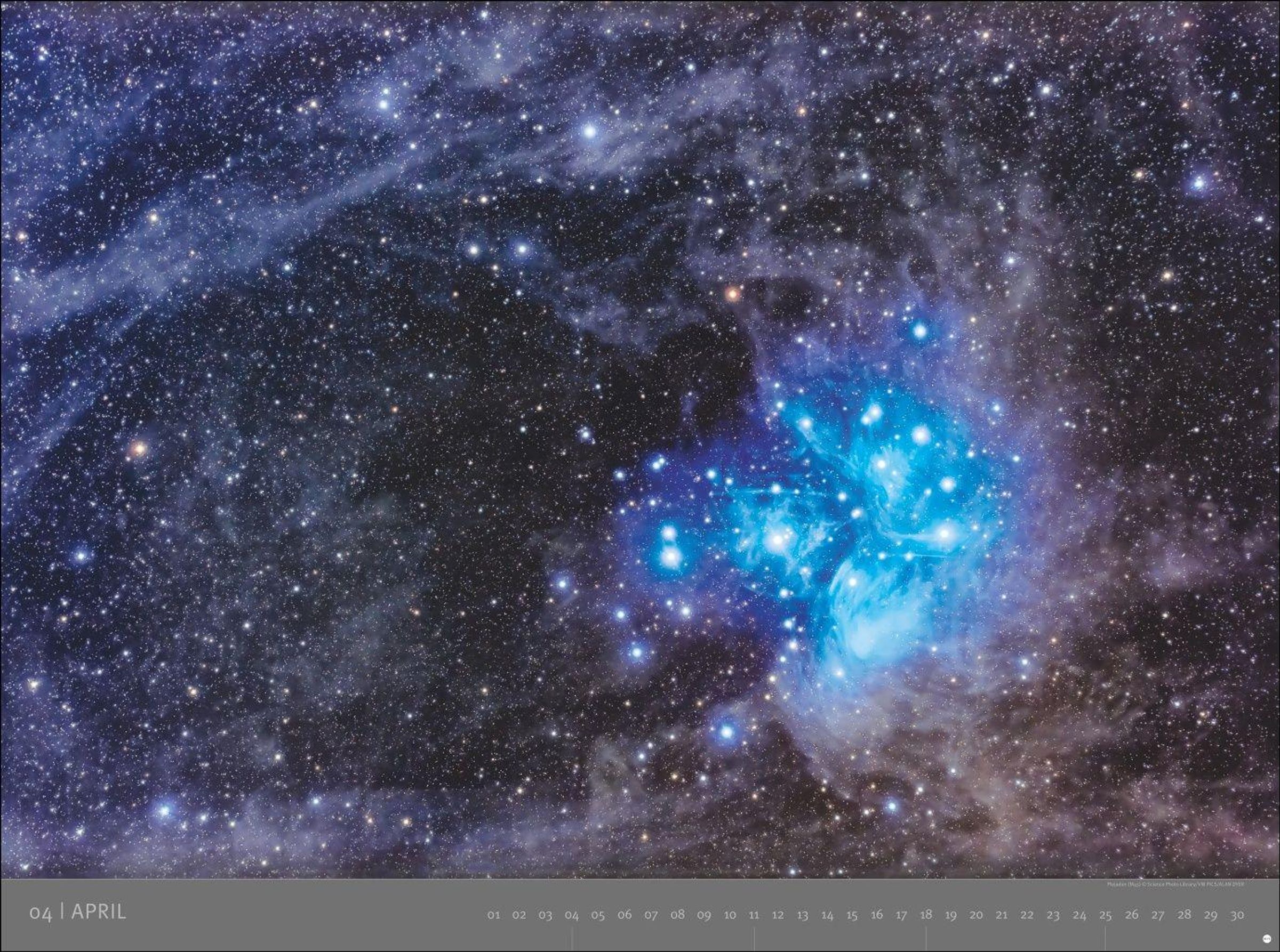 KOSMOS, Edition Alexander von Humboldt – 2027. Im Hintergrund ein Sternenhimmel mit leuchtenden blauen Nebeln., Kalender