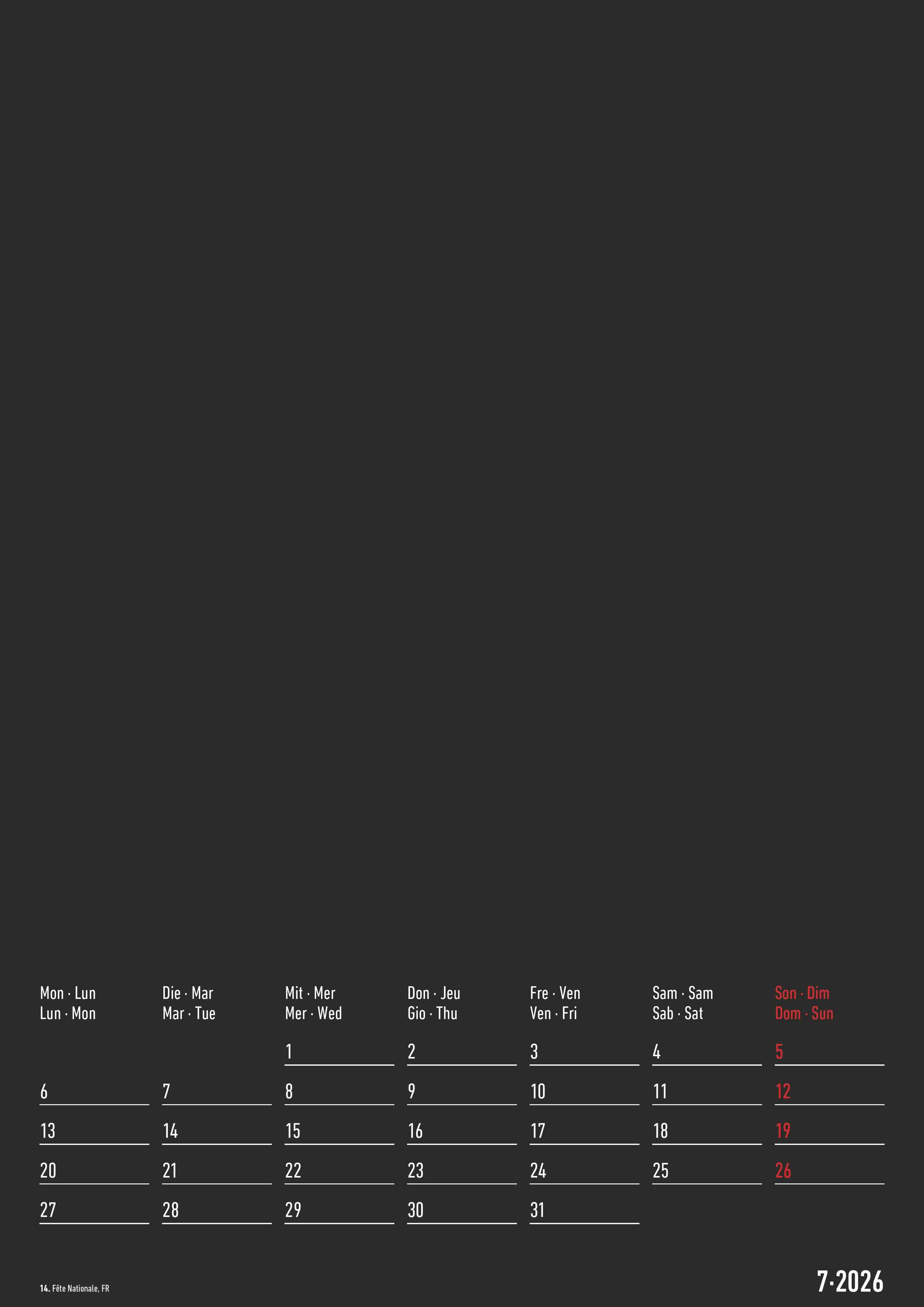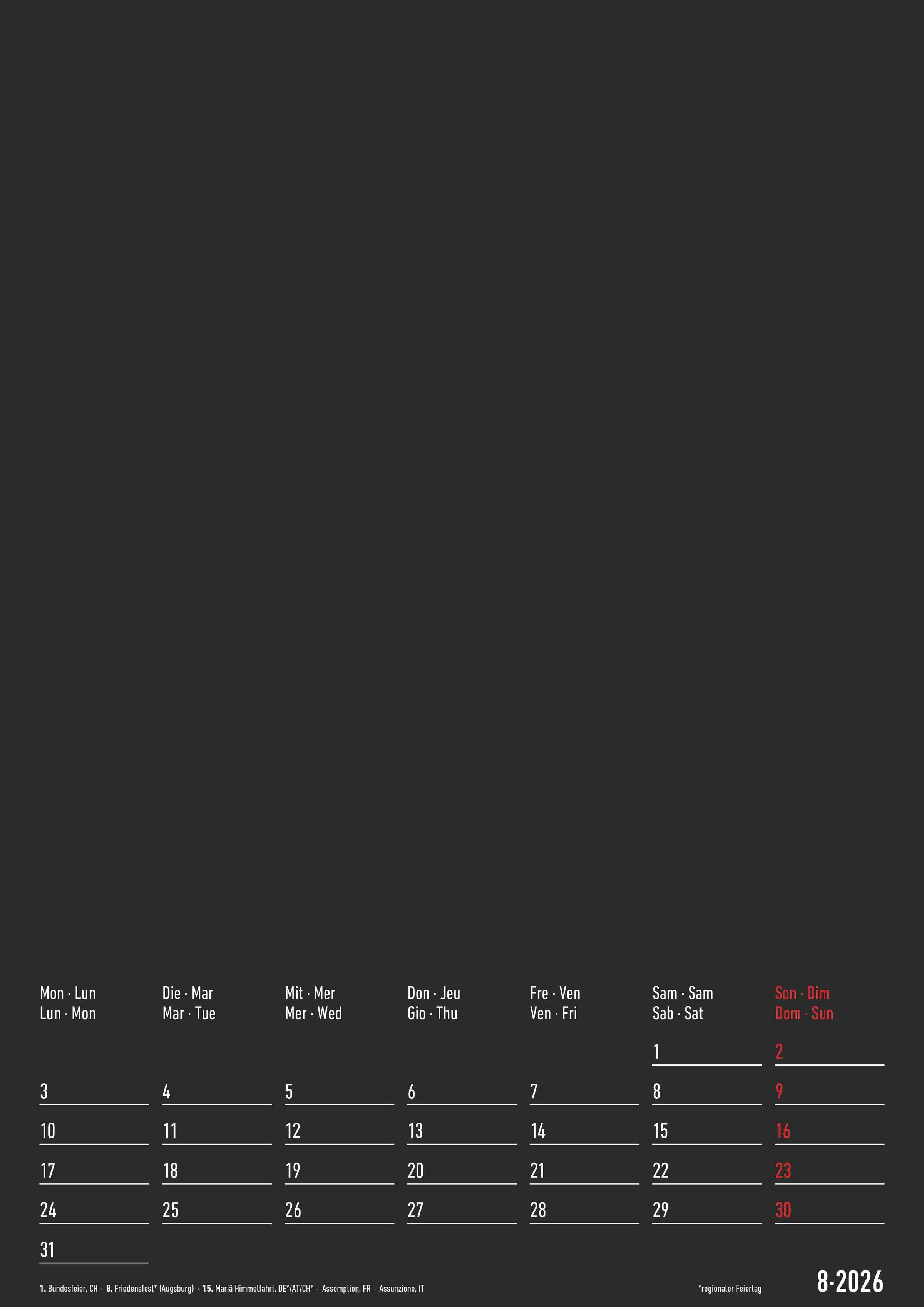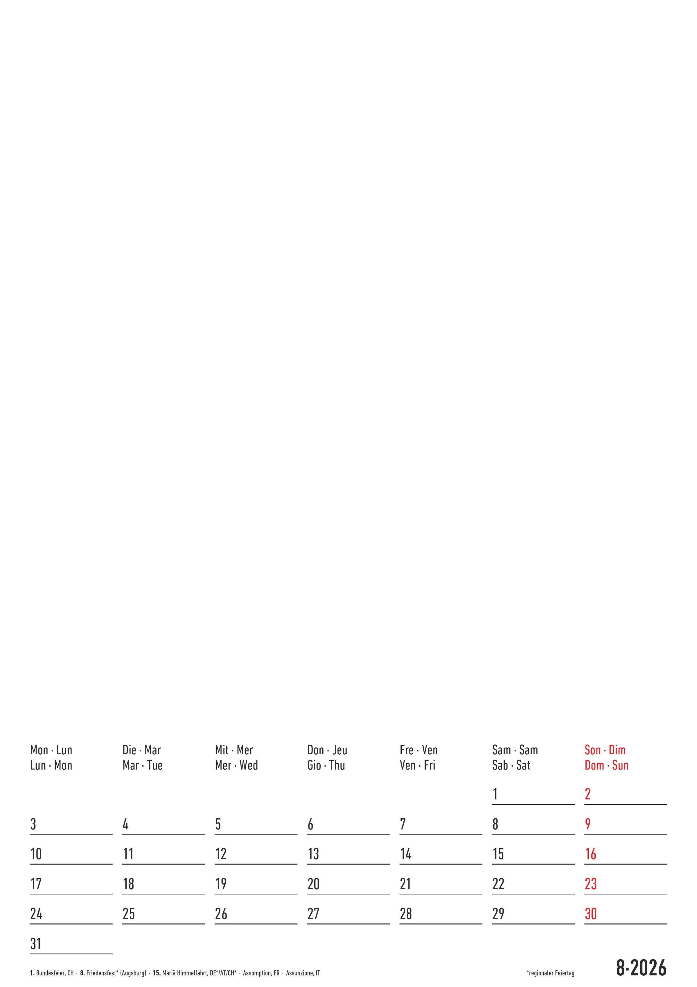 International nutzbar: 4-sprachiges Kalendarium (DE/FR/IT/GB) mit Feiertagen (DE/AT/CH/FR/IT)