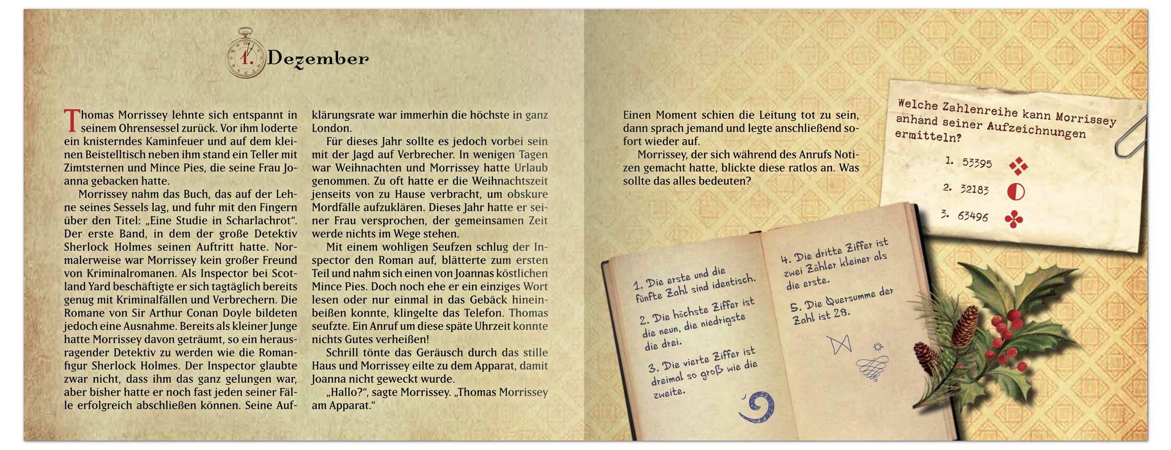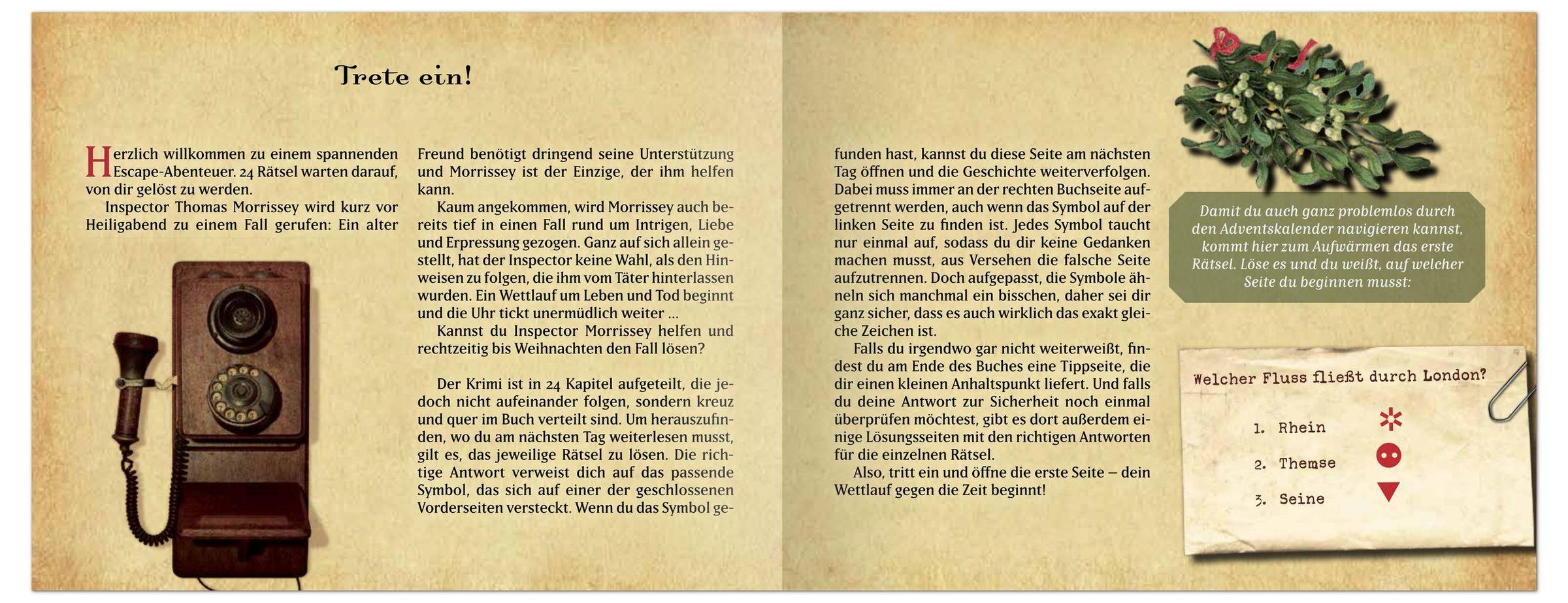 Der perfekte Weihnachtskalender für alle, die Spannung, Krimi und Escape-Room-Abenteuer lieben - ganz ohne Schokolade. Einfach am 1. Dezember die erste Doppelseite auftrennen, rätseln, lesen und mit Inspector Morrissey London erkunden.