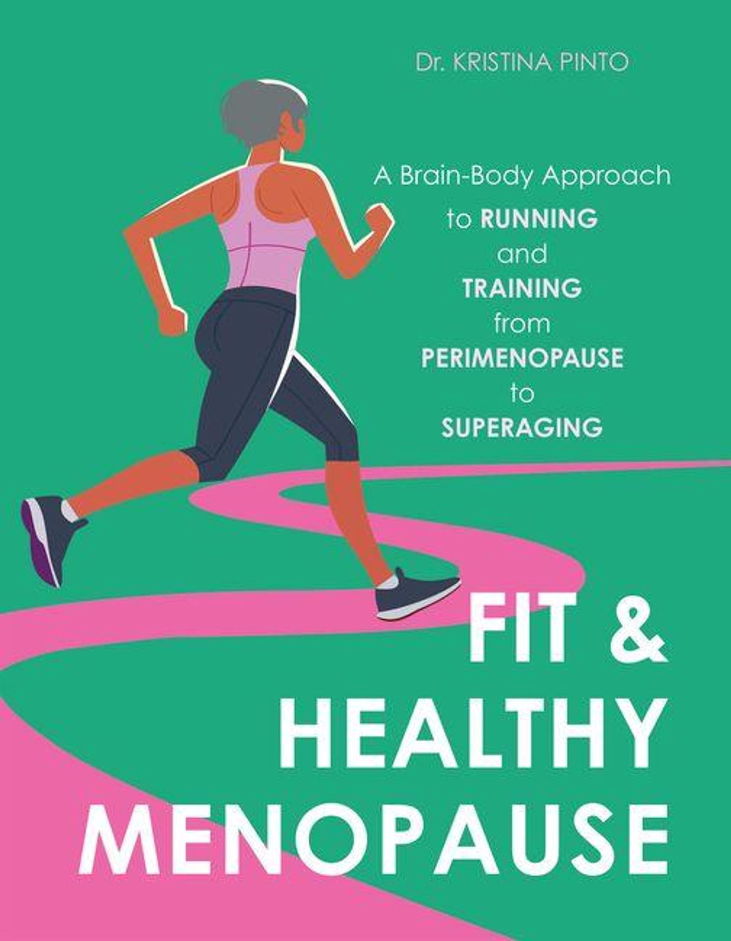 Dr. Kristina Pinto. A woman jogs energetically on a pink path, symbolizing vitality during menopause., Buch