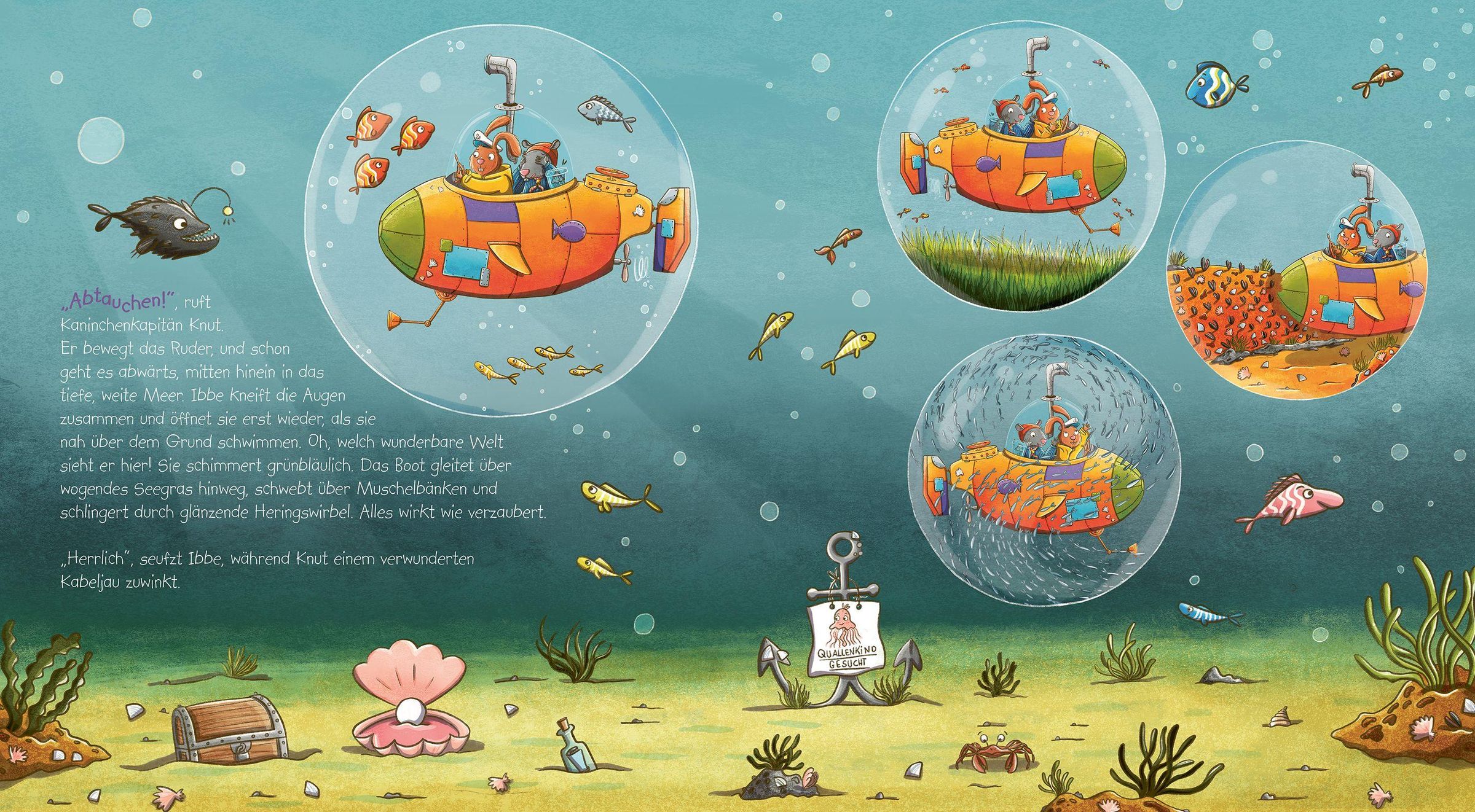Kaninchenkapitän Knut und Inselratte Ibbe haben Glück: . Es herrscht perfektes Muschelsammelwetter und die beiden machen sich auf den Weg zum Strand. Doch was hören sie da? Ein verletztes Quallenkind gluckert um Hilfe und schafft es nicht alleine zur Feier seines Opas am alten Schiffswrack. Die zwei besten Freunde sind sofort zur Stelle. In einem U-Boot und mit der Hilfe eines Schweinswals tauchen die drei ab, hinein in die Unterwasserwelt ...