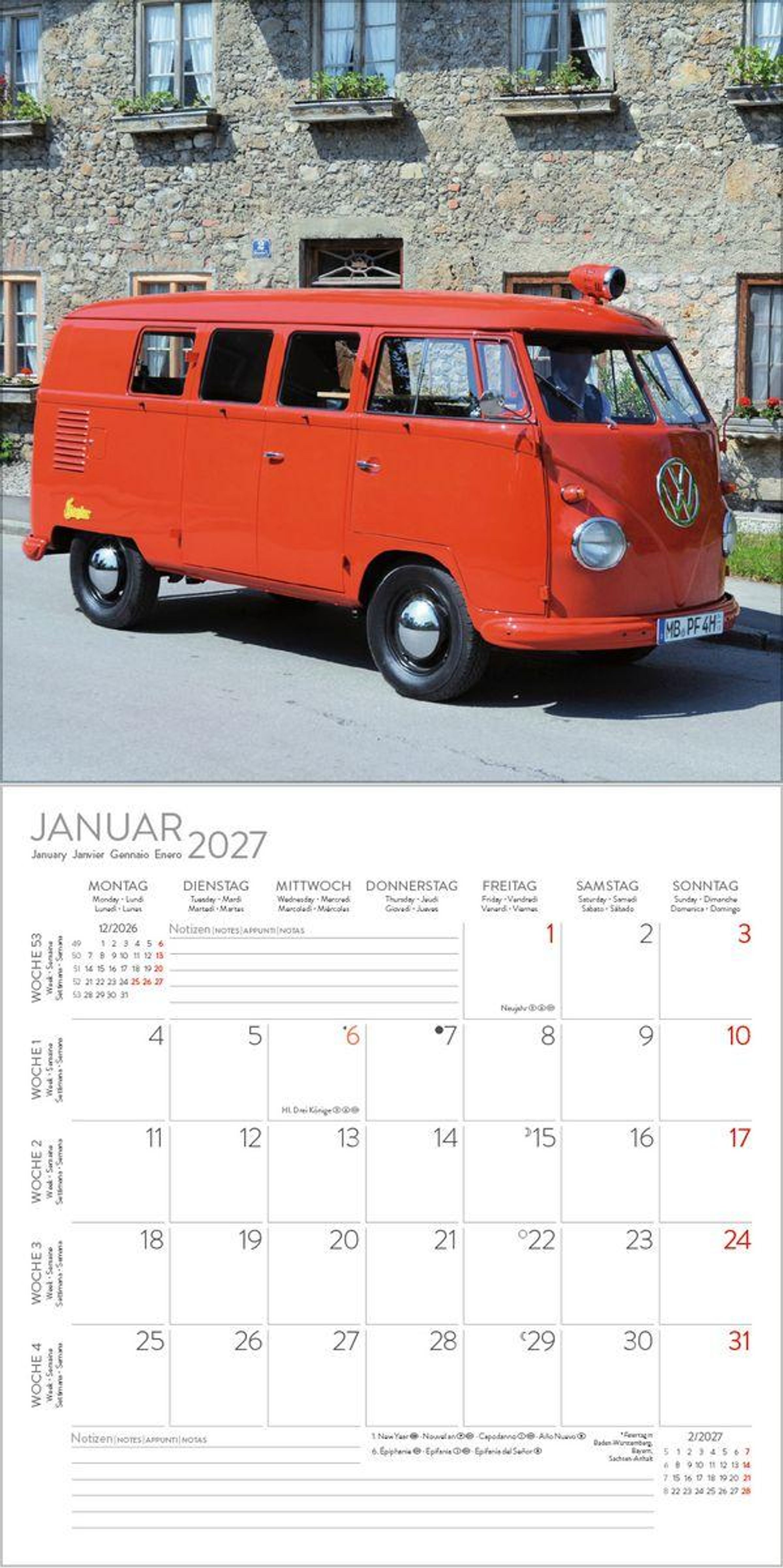 Produktmerkmale Wandkalender im Format: 30 x 30 cm; Offenes Format: 30 x 60 cm; umweltfreundliches FSC Papier Jede Kalenderseite mit großem Bild und viel Platz im Kalendarium für Notizen und Termine Mehrsprachiges Kalendarium: DE/GB/FR/IT/ES mit Feiertagen für D/A/CH/GB/FR/IT/ES Regionale Ferienzeiten für DE/A/CH Monatsübersicht für den jeweiligen Vor- und Nachmonat; Jahresübersicht Ob als Wohnmobil, Familienfahrzeug, Transporter oder begehrtes Sammlerobjekt, eine gelungene Auswahl an Kult-Transportern ziert diesen praktischen Kalender.