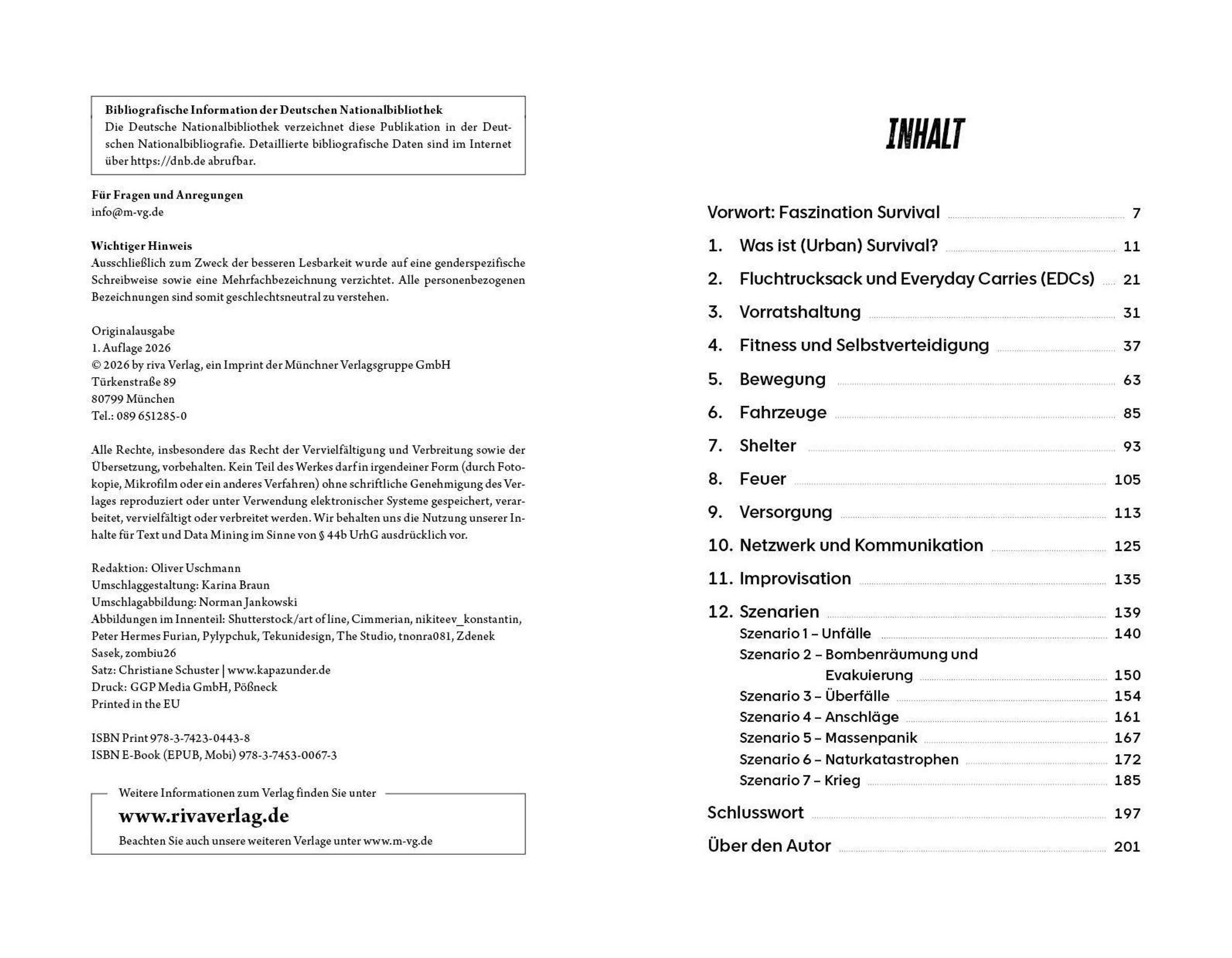 Fern von Hysterie erklärt der Survival-Experte, Bestsellerautor und frühere SEK-Beamte Kuni, worauf es dabei wirklich ankommt. Er erläutert, was in einen Fluchtrucksack gehört und welche Grundausstattung immer griffbereit sein sollte, aber auch, wie man sich in Extremsituationen - etwa bei einem Amoklauf - verhält oder im Fall der Fälle aus der Stadt flüchtet und im Umland überlebt.
