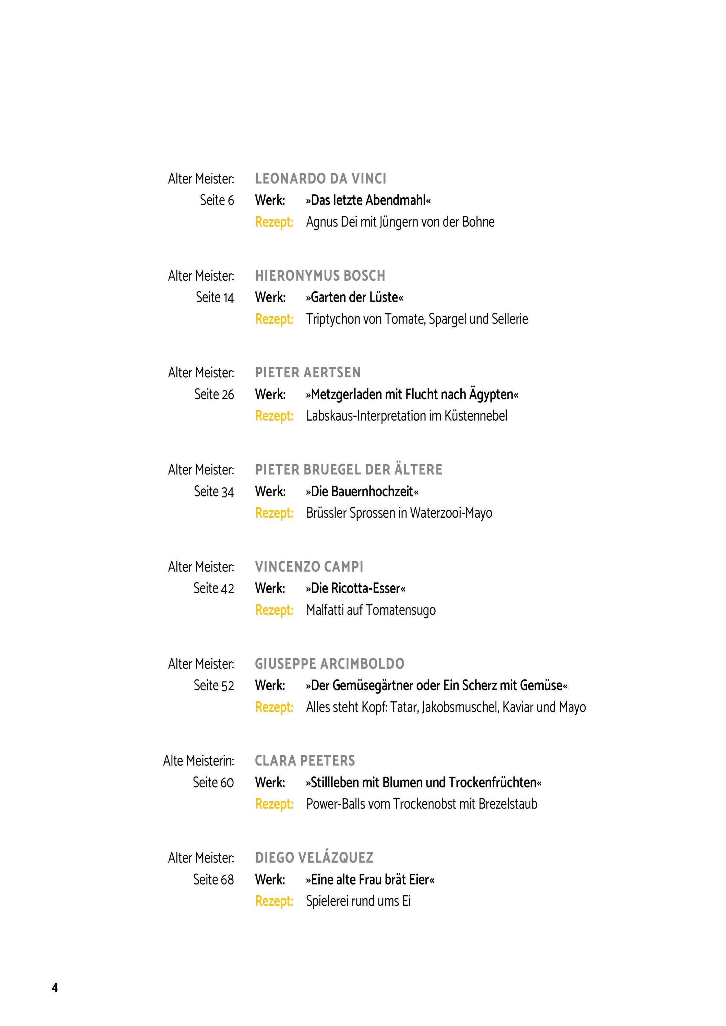 "KUNST ESSEN" ist ein faszinierender Bildband, der Koch- und Kunstbuch vereint. Im Mittelpunkt steht das Essen als kulturprägender Bestandteil der Kunst. In 15 Kapiteln werden bedeutende Werke der Kunstgeschichte vom Mittelalter bis heute neu interpretiert und ihre Meisterinnen und Meister vorgestellt. Inspiriert von den Gemälden entstehen Gerichte mit Rezepten zum Nachkochen. Die Speisen werden als eigenständige, fotografisch inszenierte Gesamtkunstwerke präsentiert, ganz anders als jeder herkömmliche Serviervorschlag! Das Buch verbindet klassische Gemälde, praktische Küchentipps, humorvolle Texte und innovative Food-Fotografie zu einem einzigartigen geistigen und sinnlichen Vergnügen. Es soll Lust machen auf Museumsbesuche, Kochen und Kunst an sich - sei es an der Leinwand, mit der Kamera oder am Herd.