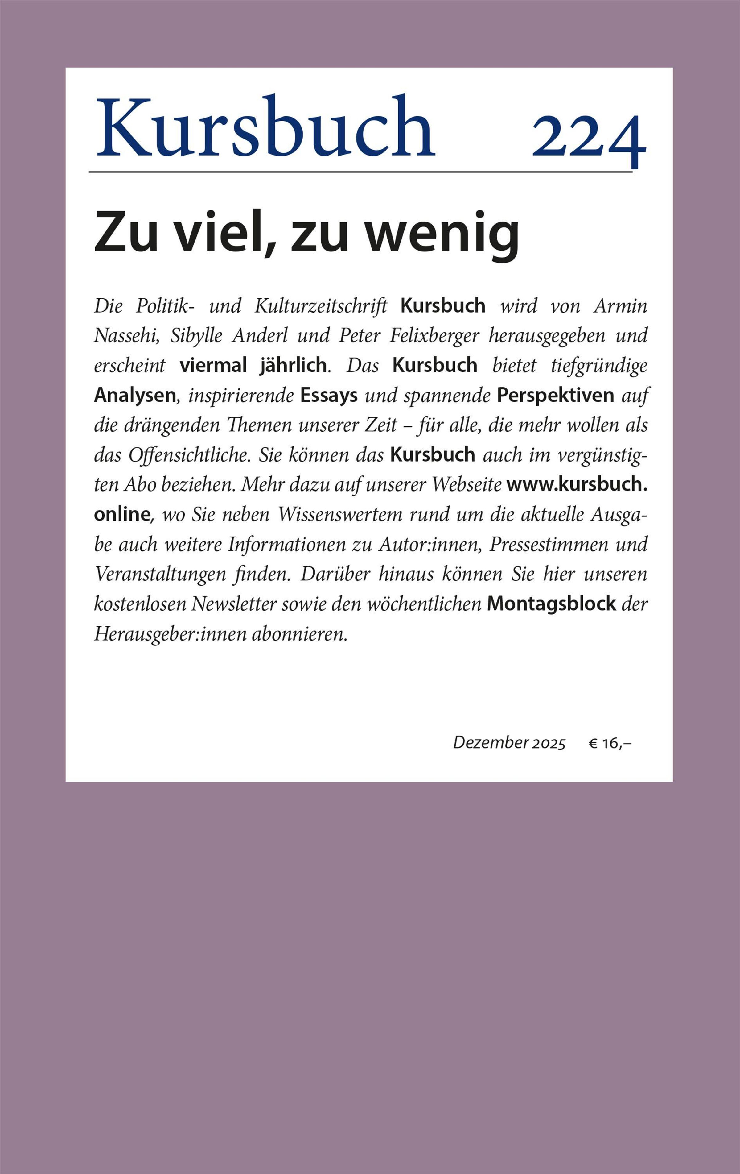 Die Politik- und Kulturzeitschrift Kursbuch wird von Armin Nassehi, Sibylle Anderl und Peter Felixberger herausgegeben und erscheint viermal jährlich. Das Kursbuch bietet tiefgründige Analysen, inspirierende Essays und spannende Perspektiven auf die drängenden Themen unserer Zeit - für alle, die mehr wollen als das Offensichtliche. Sie können das Kursbuch auch im vergünstigten Abo beziehen. Mehr dazu auf unserer Webseite www. kursbuch. online, wo Sie neben Wissenswertem rund um die aktuelle Ausgabe auch weitere Informationen zu Autor: innen, Pressestimmen und Veranstaltungen finden. Darüber hinaus können Sie hier unseren kostenlosen Newsletter sowie den wöchentlichen Montagsblock der Herausgeber: innen abonnieren.