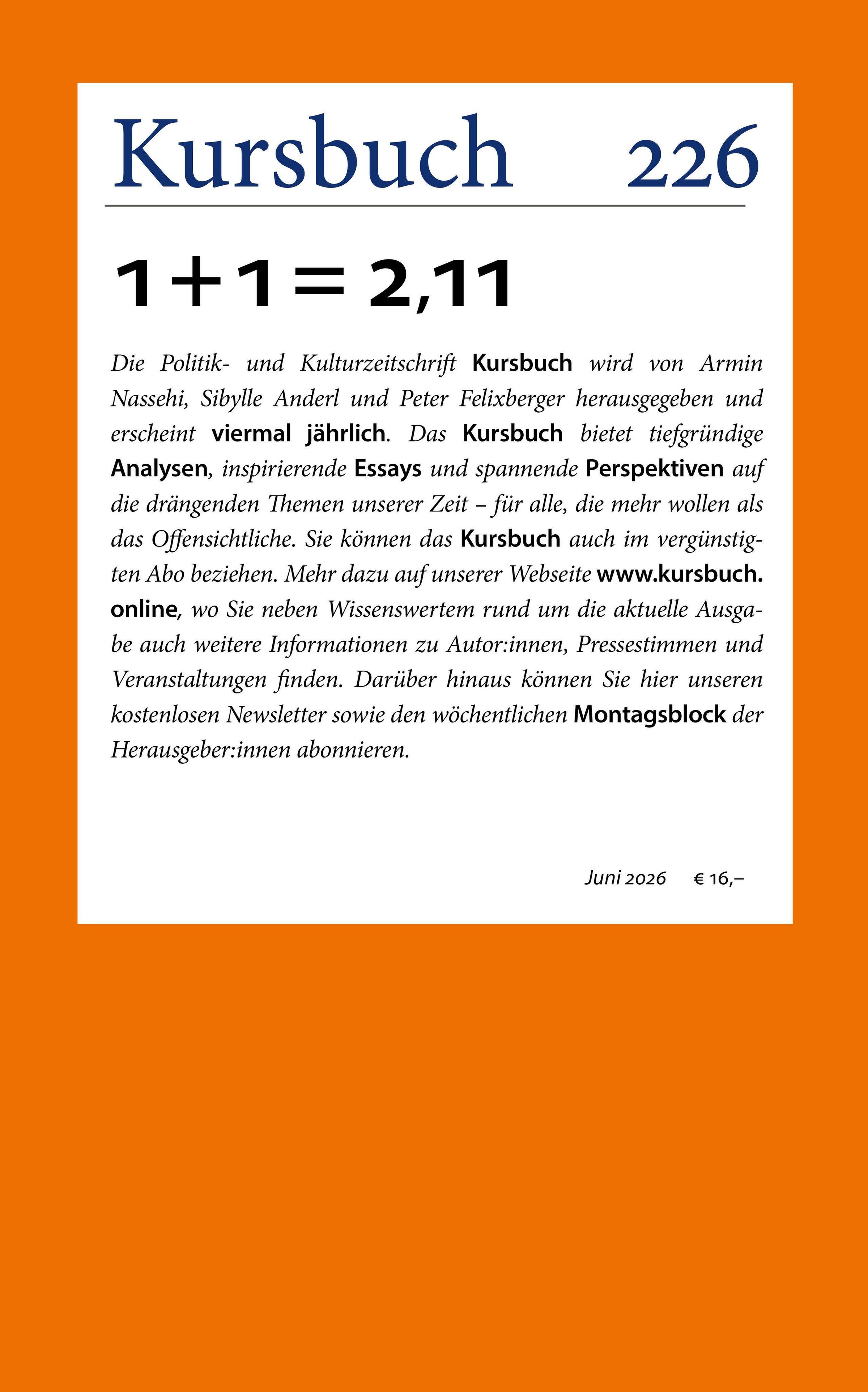 Die Politik- und Kulturzeitschrift Kursbuch wird von Armin Nassehi, Sibylle Anderl und Peter Felixberger herausgegeben und erscheint viermal jährlich. Das Kursbuch bietet tiefgründige Analysen, inspirierende Essays und spannende Perspektiven auf die drängenden Themen unserer Zeit - für alle, die mehr wollen als das Offensichtliche. Sie können das Kursbuch auch im vergünstigten Abo beziehen. Mehr dazu auf unserer Webseite www. kursbuch. online, wo Sie neben Wissenswertem rund um die aktuelle Ausgabe auch weitere Informationen zu Autor: innen, Pressestimmen und Veranstaltungen finden. Darüber hinaus können Sie hier unseren kostenlosen Newsletter sowie den wöchentlichen Montagsblock der Herausgeber: innen abonnieren.