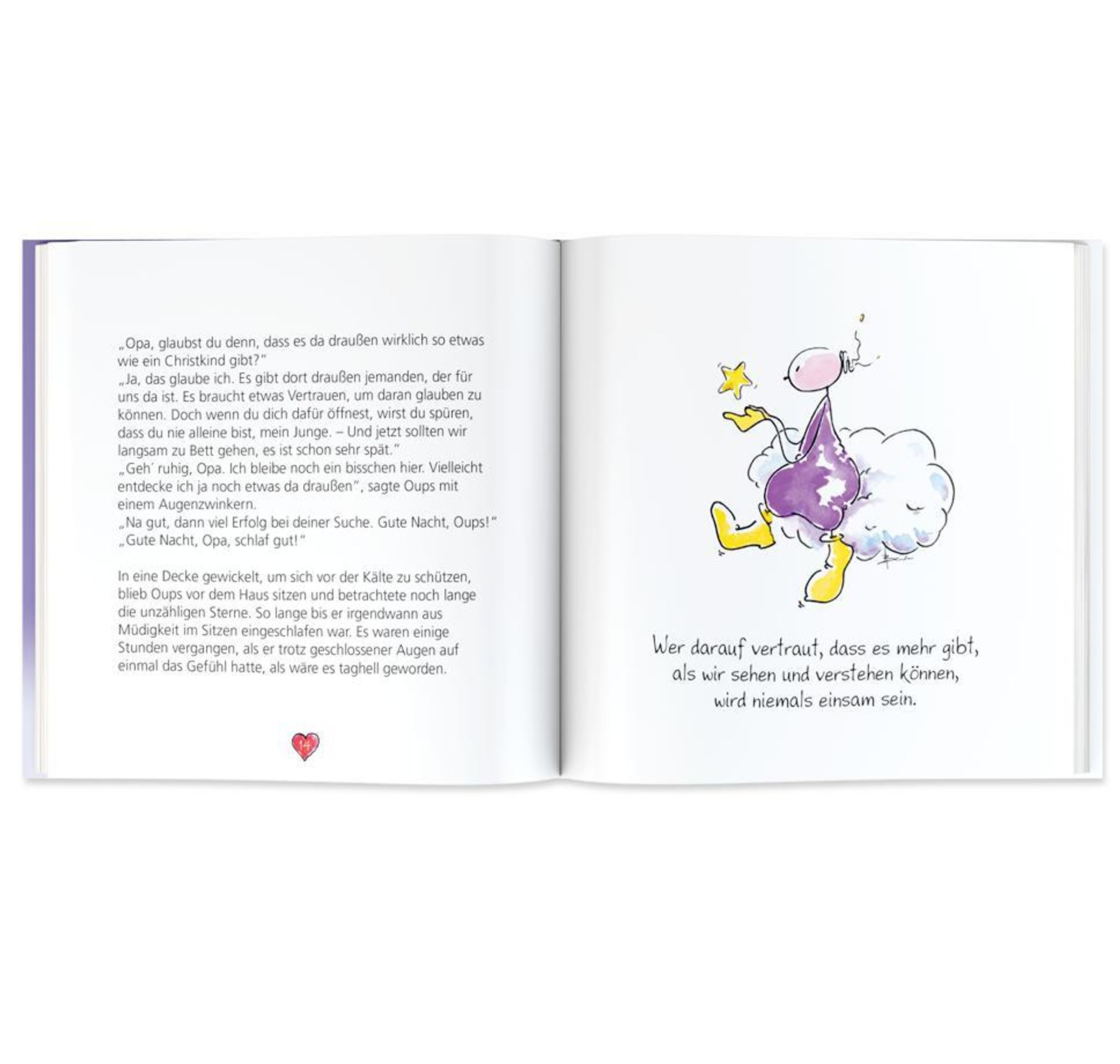 Auf liebevolle und berührende Weise vermittelt Oups, dass Weihnachten mehr ist als "nur" ein Fest im Jahr, an dem es Päckchen zu verteilen gibt. Diese Weihnachtsgeschichte zaubert ein Lächeln in die Herzen der LeserInnen - egal ob groß oder klein! Denn Dank der märchenhaften Sprache von Autor Kurt Hörtenhuber berühren die liebenswerten Botschaften von Oups nicht nur Erwachsene, sondern bringen auch die Herzen der Kinder zum Leuchten ... Ein Buch, das nicht nur zur Weihnachtszeit gerne in die Hand genommen wird! Mit zauberhaften Illustrationen von Günter Bender.