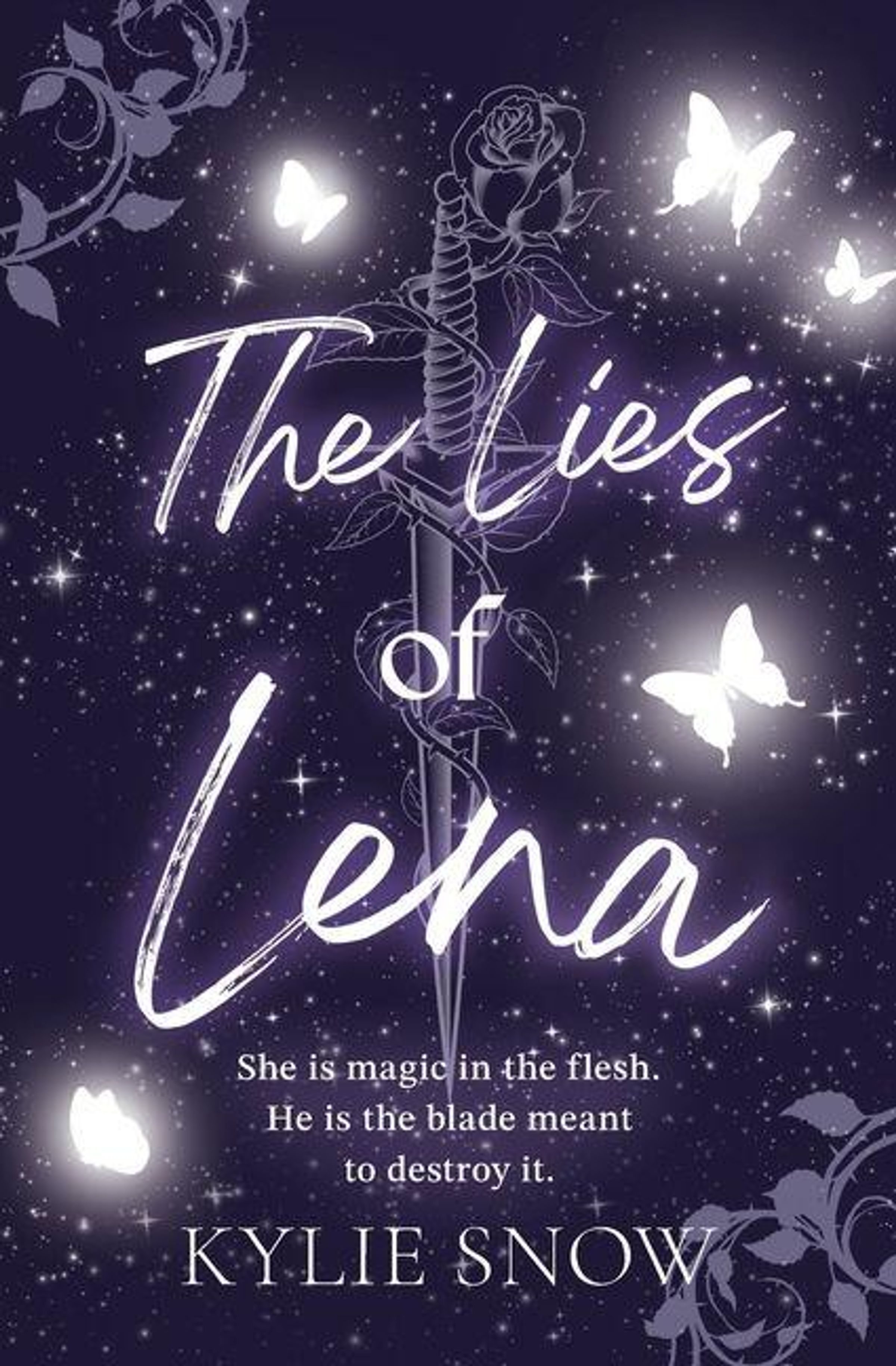 "The Lies of Lena" von Kylie Snow. Schmetterlinge, ein Dolch mit Rose und Sterne auf dunklem Hintergrund., Buch
