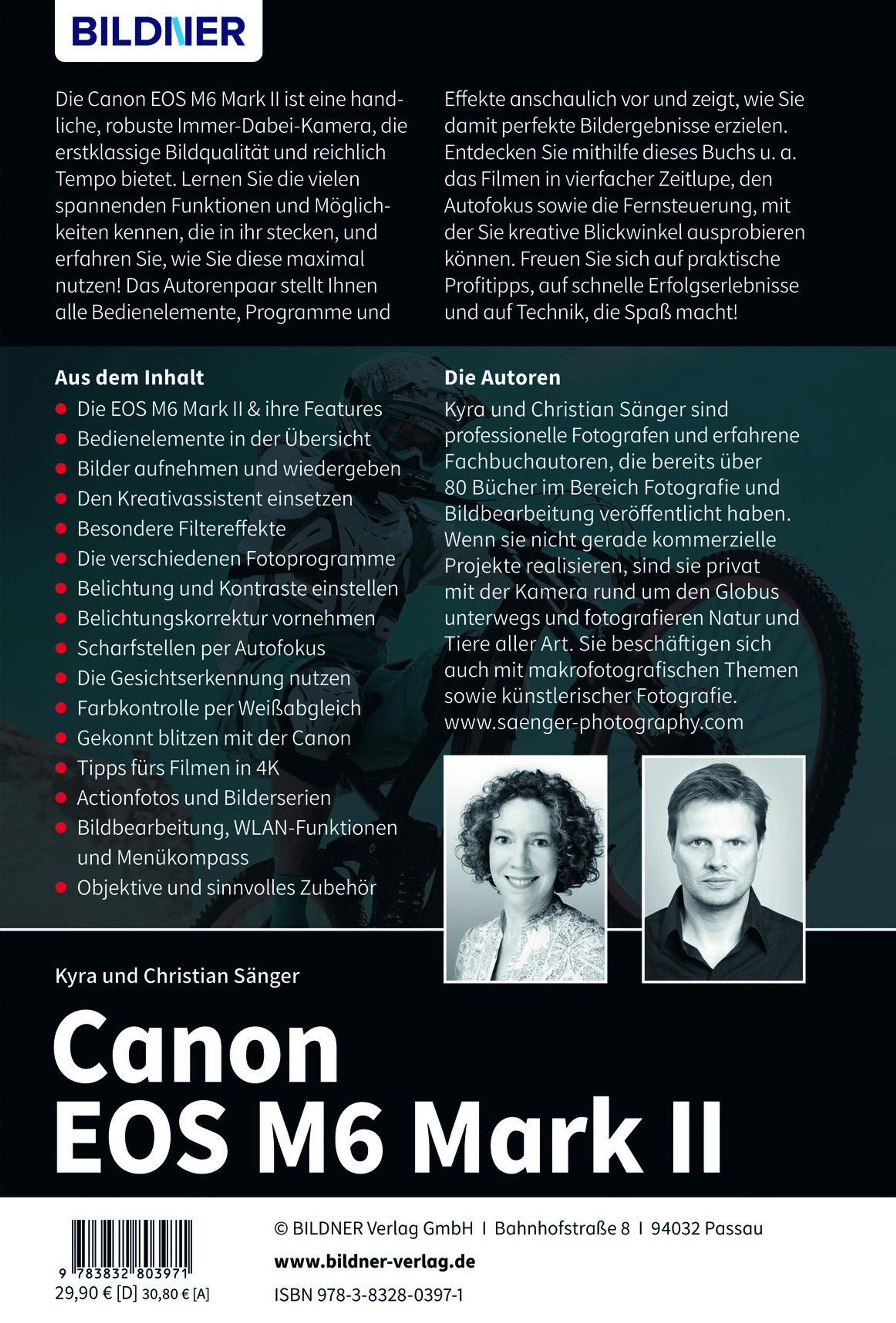 Die Canon EOS M6 Mark II ist eine robuste Immer-Dabei-Kamera, die erstklassige Bildqualität und reichlich Tempo bietet. Lernen Sie die vielen spannenden Funktionen und Möglichkeiten kennen, die in ihr stecken, und erfahren Sie, wie Sie diese maximal nutzen ! Das Autorenpaar stellt Ihnen alle Bedienelemente, Programme und Effekte anschaulich vor und zeigt, wie Sie damit perfekte Bildergebnisse erzielen. Entdecken Sie mithilfe dieses Buchs u. a. das Filmen in Zeitlupe und die Fernsteuerung, mit der Sie kreative Blickwinkel ausprobieren können. Freuen Sie sich auf praktische Profitipps , auf schnelle Erfolgserlebnisse und auf Technik, die Spaß macht!