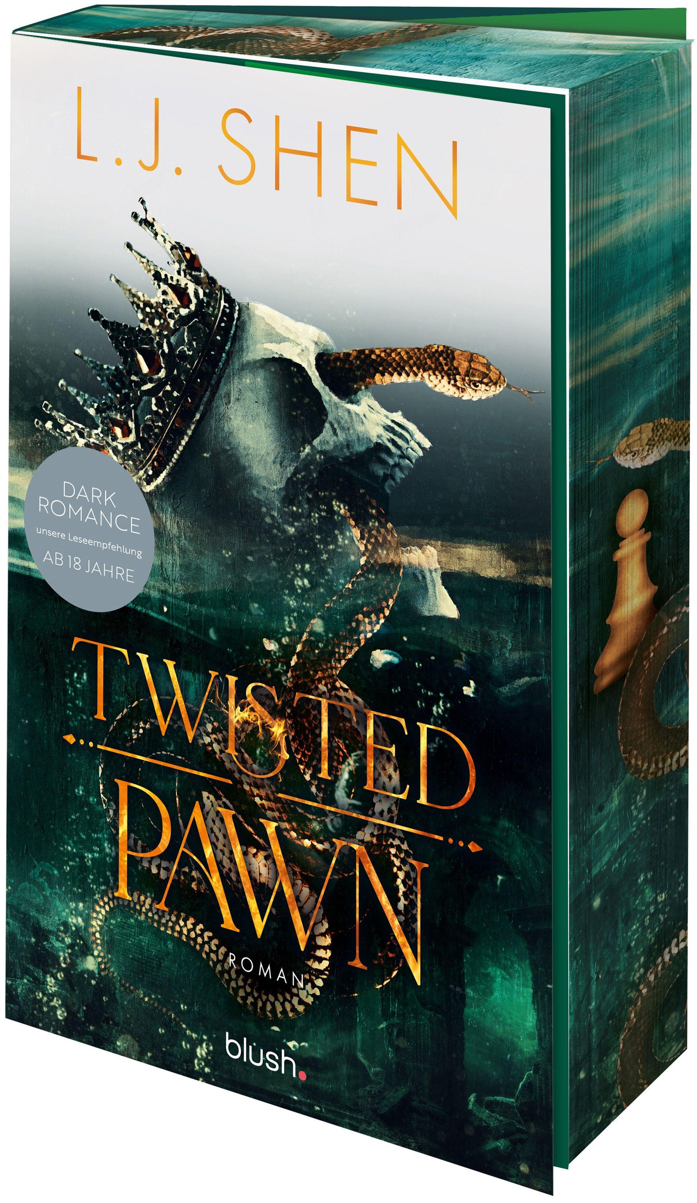 L. J. Shen, Twisted Pawn, Dark Romance, ab 18 Jahre. Eine Krone und Schlange auf einem Unterwassermotiv in dunklen Tönen., Buch