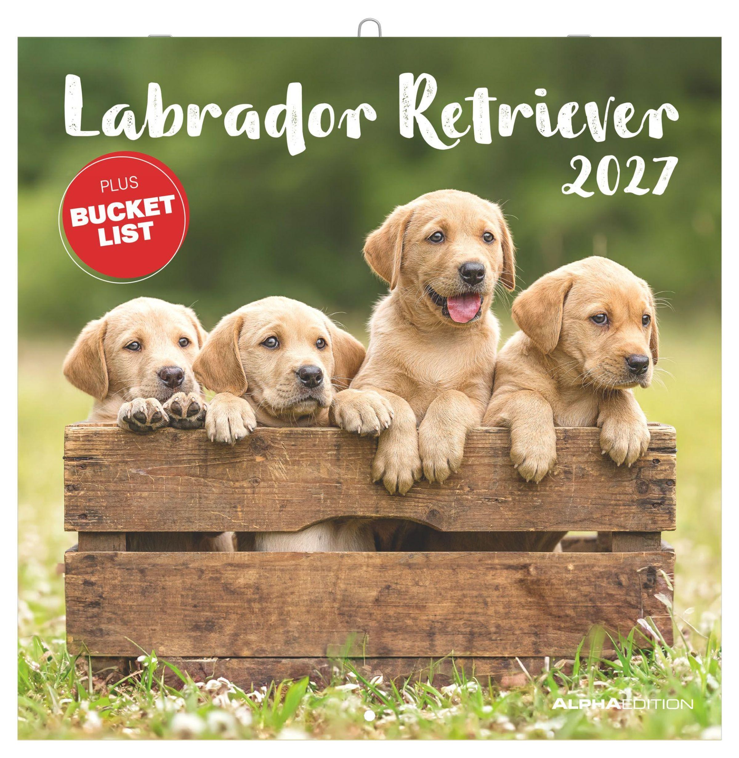 Text: "Labrador Retriever 2027" und "PLUS BUCKET LIST". Vier Welpen schauen aus einer Holzkiste., Kalender