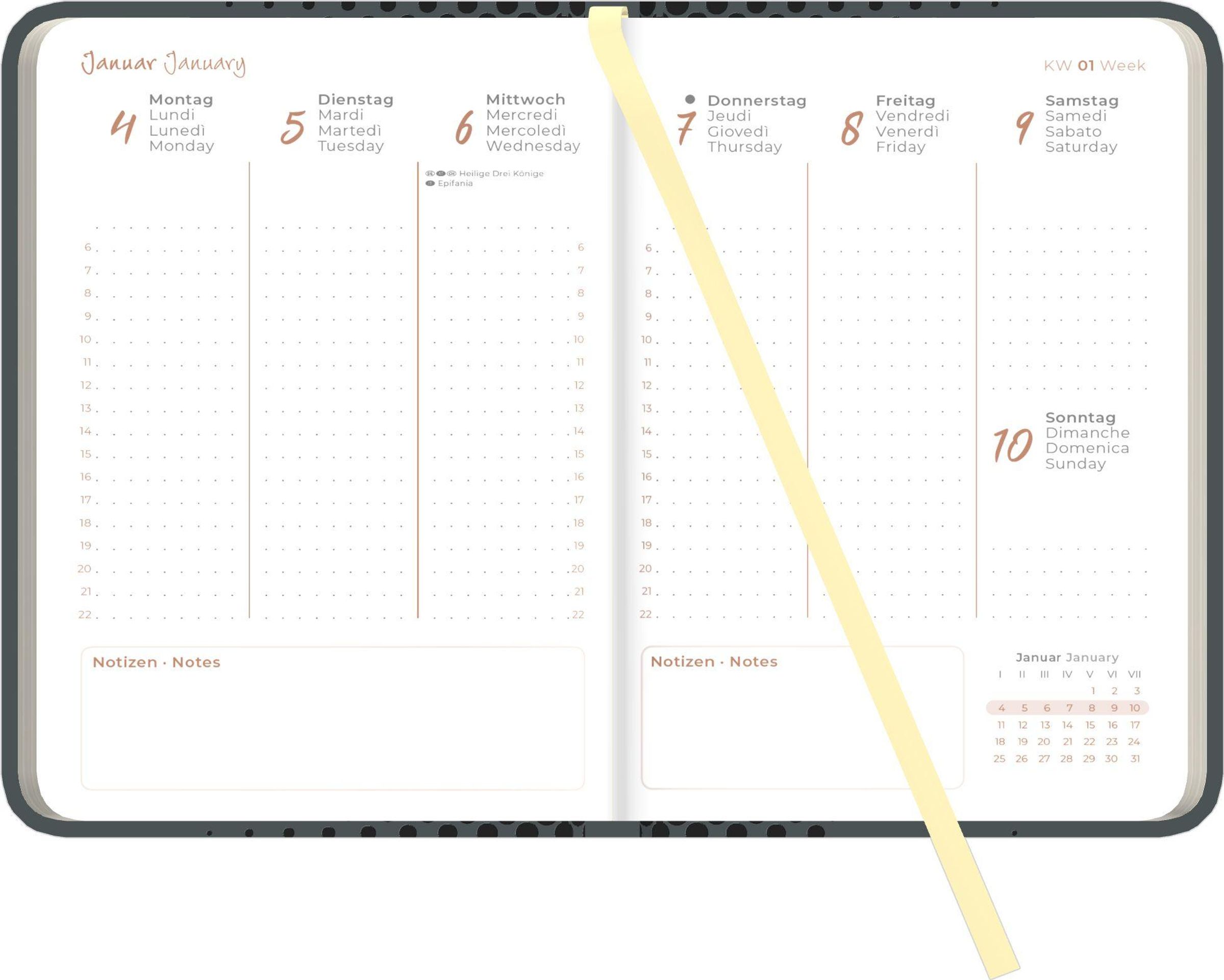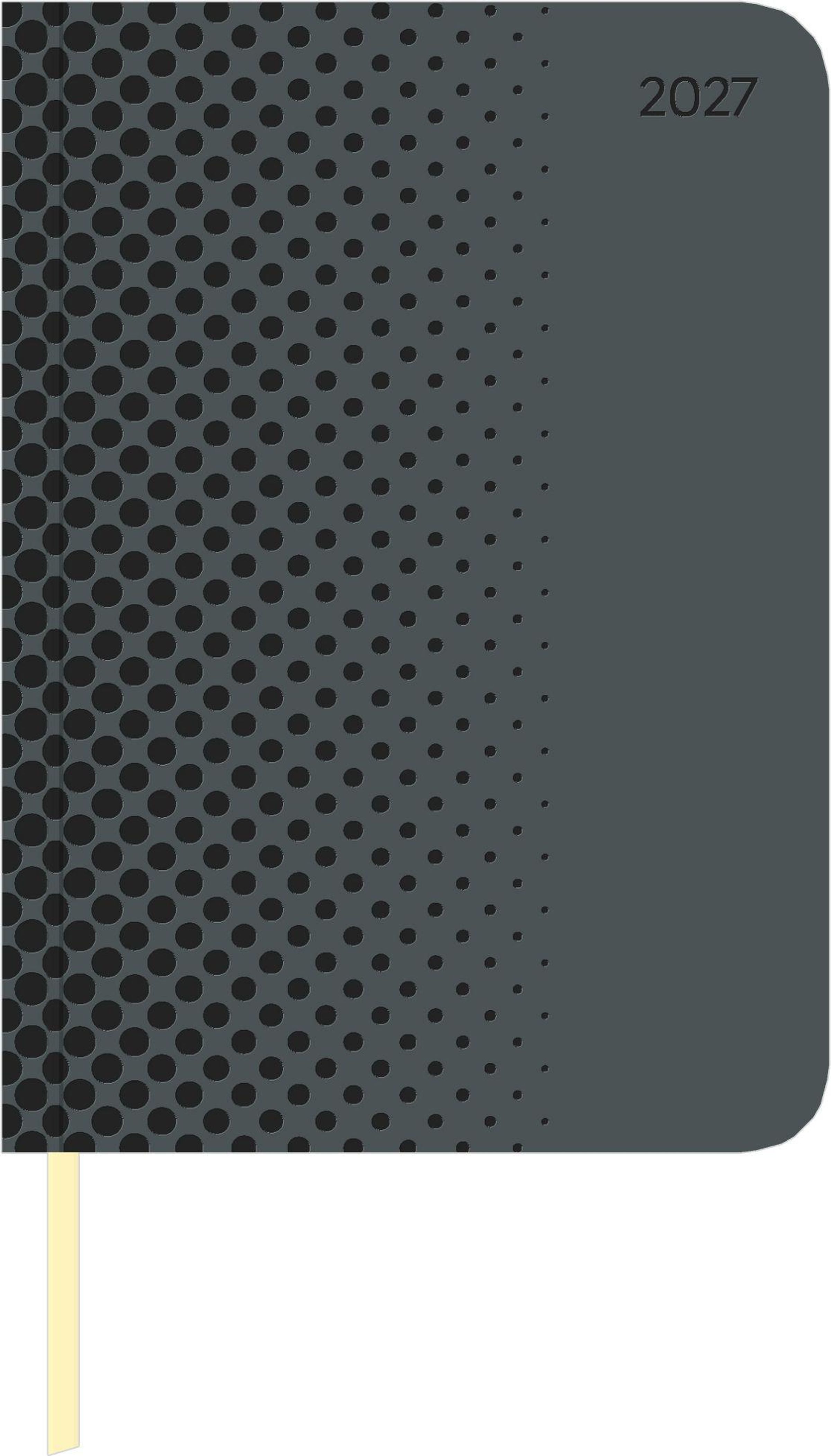Text: "2027". Dunkelgrauer Einband mit Punktemuster auf der linken Seite und einem beigen Lesezeichen., Buch