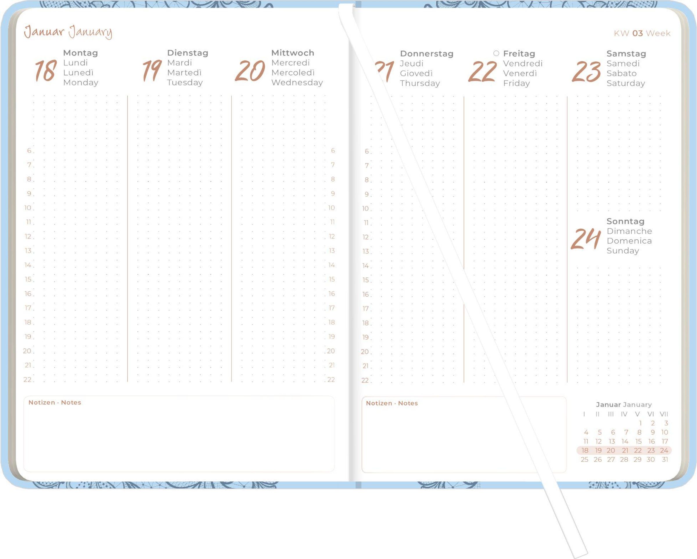 Praktische Wochenübersicht: 1 Kalenderwoche pro Doppelseite, Zeiteinteilung 06--22 Uhr, zusätzlicher Platz für Notizen