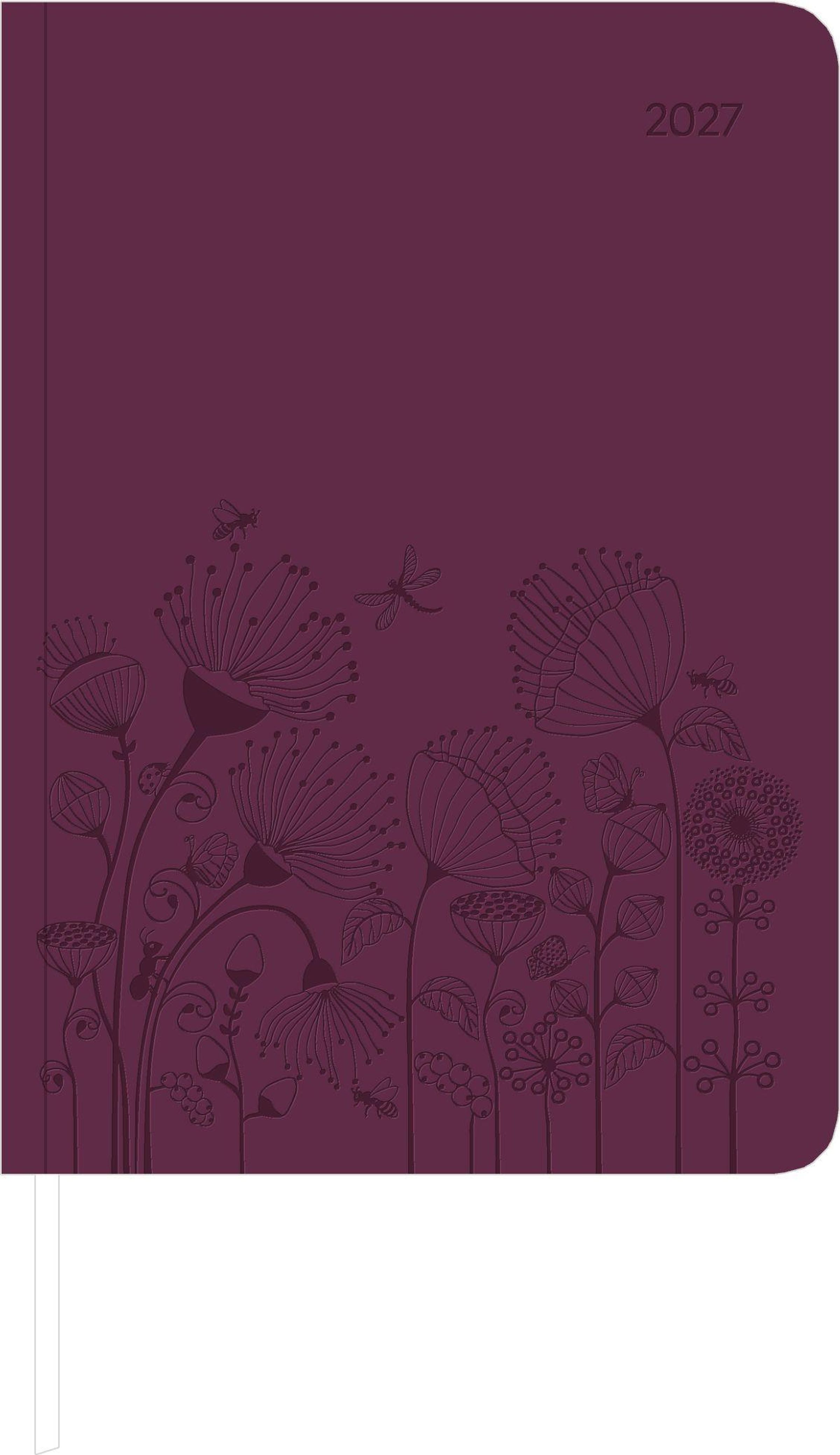 "2027" oben rechts; Blumen und Insekten zieren den unteren Bereich in Lila auf einem dunkleren Hintergrund., Buch