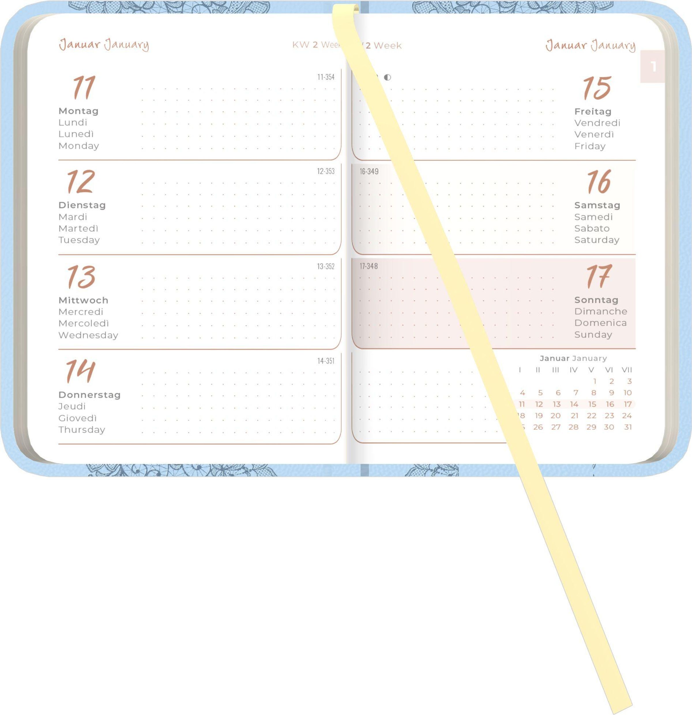 Das Alpha Edition Lady Journal Mini Deluxe Hellblau 2027 vereint elegantes Design mit einer kompakten Wochenplanung. Der weiche, lederähnliche Tucson-Einband mit edler Motivprägung macht diesen kleinen Taschenkalender zu einem stilvollen Begleiter für den Alltag. Das übersichtliche Kalendarium bietet ausreichend Platz für Termine und Notizen, ergänzt durch zahlreiche praktische Zusatzseiten und Informationsübersichten.