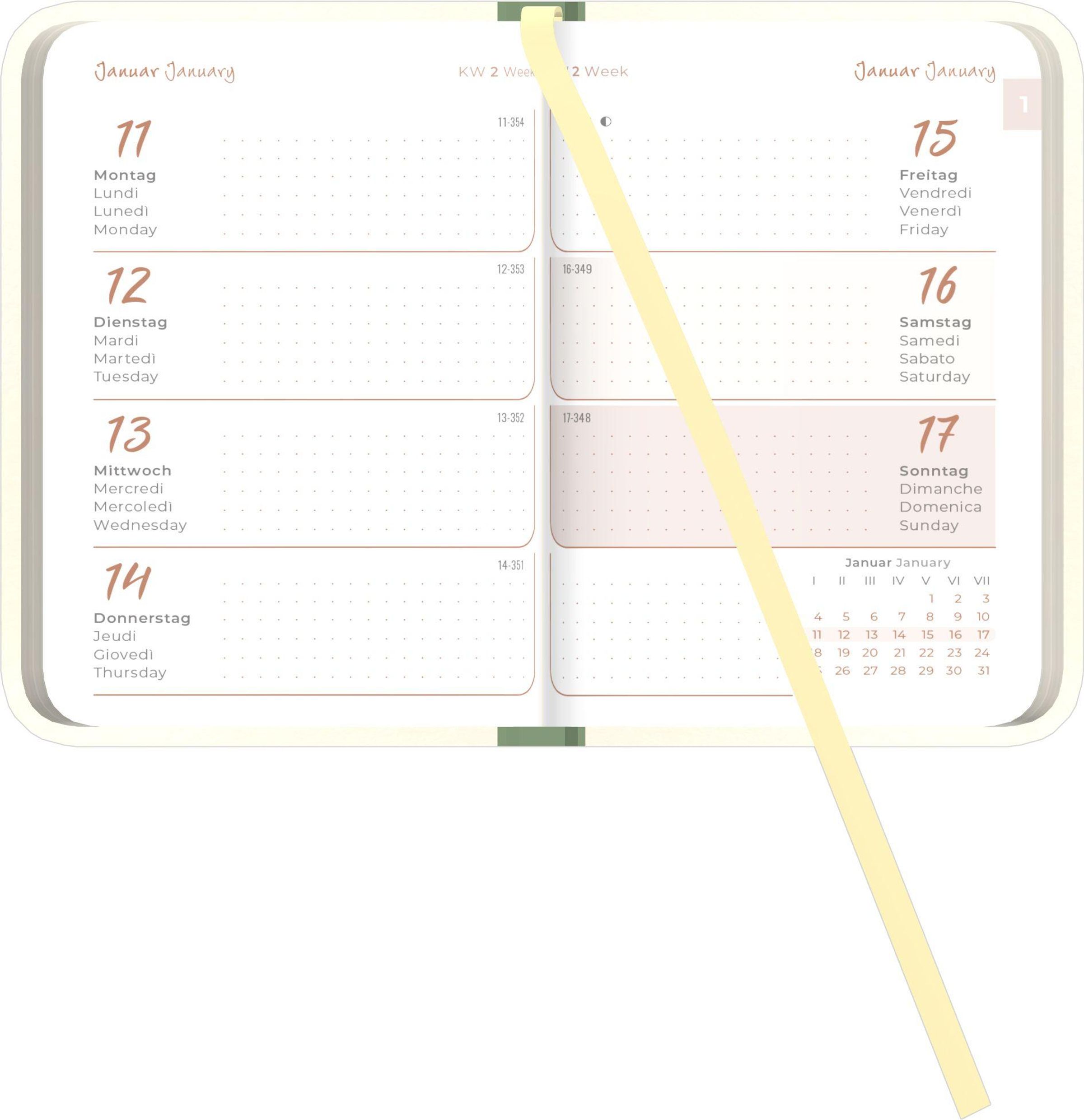 Mehrsprachig & informativ: 4-sprachiges Kalendarium (DE/FR/IT/GB) mit Feiertagen (DE/AT/CH/FR/IT)