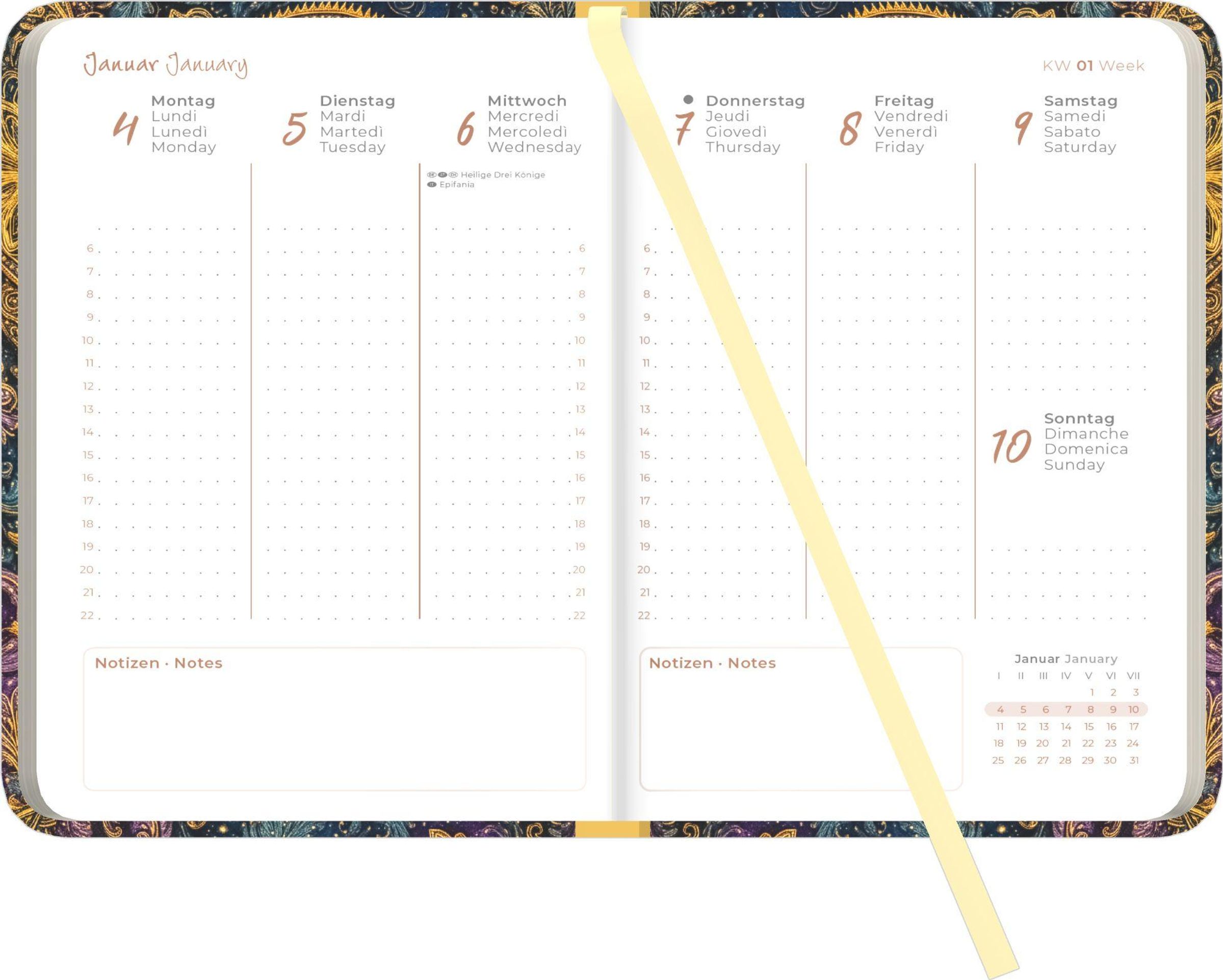 - Gebunden, Lesebändchen, internationales Kalendarium, leicht abgerundete Ecken, 1 Woche 2 Seiten, A6