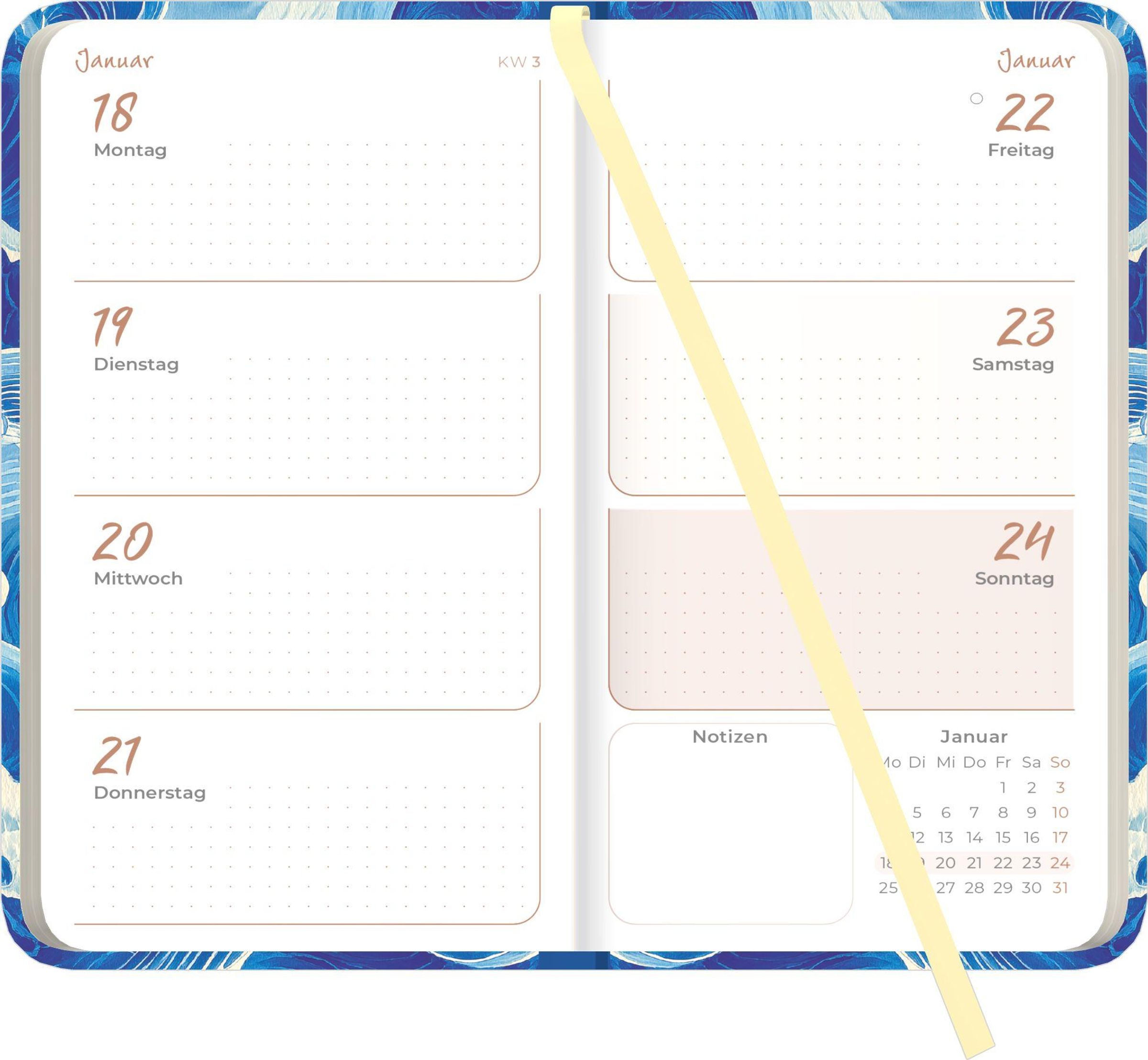 Hochwertige Ausstattung: Robuster, matter Einband im eleganten Waves-Design, Leseband, fein gerundete Ecken