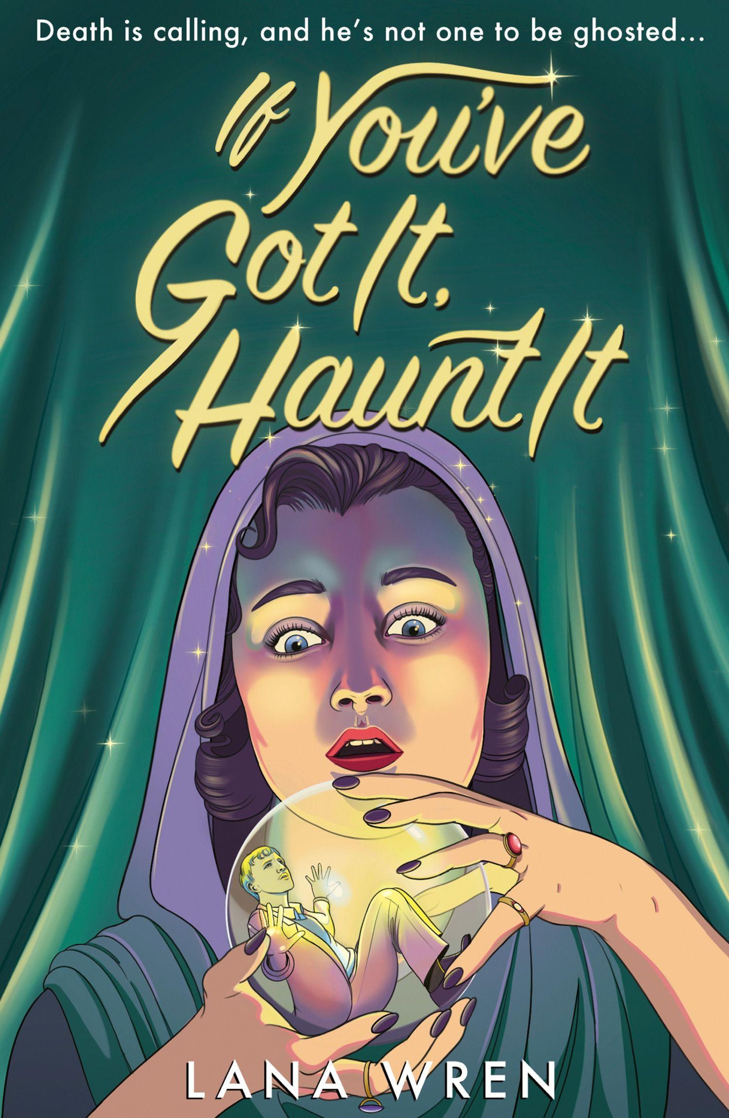 Oben steht: "Death is calling, and he’s not one to be ghosted..." Ein überrascht blickendes Gesicht hält eine Kristallkugel., Buch