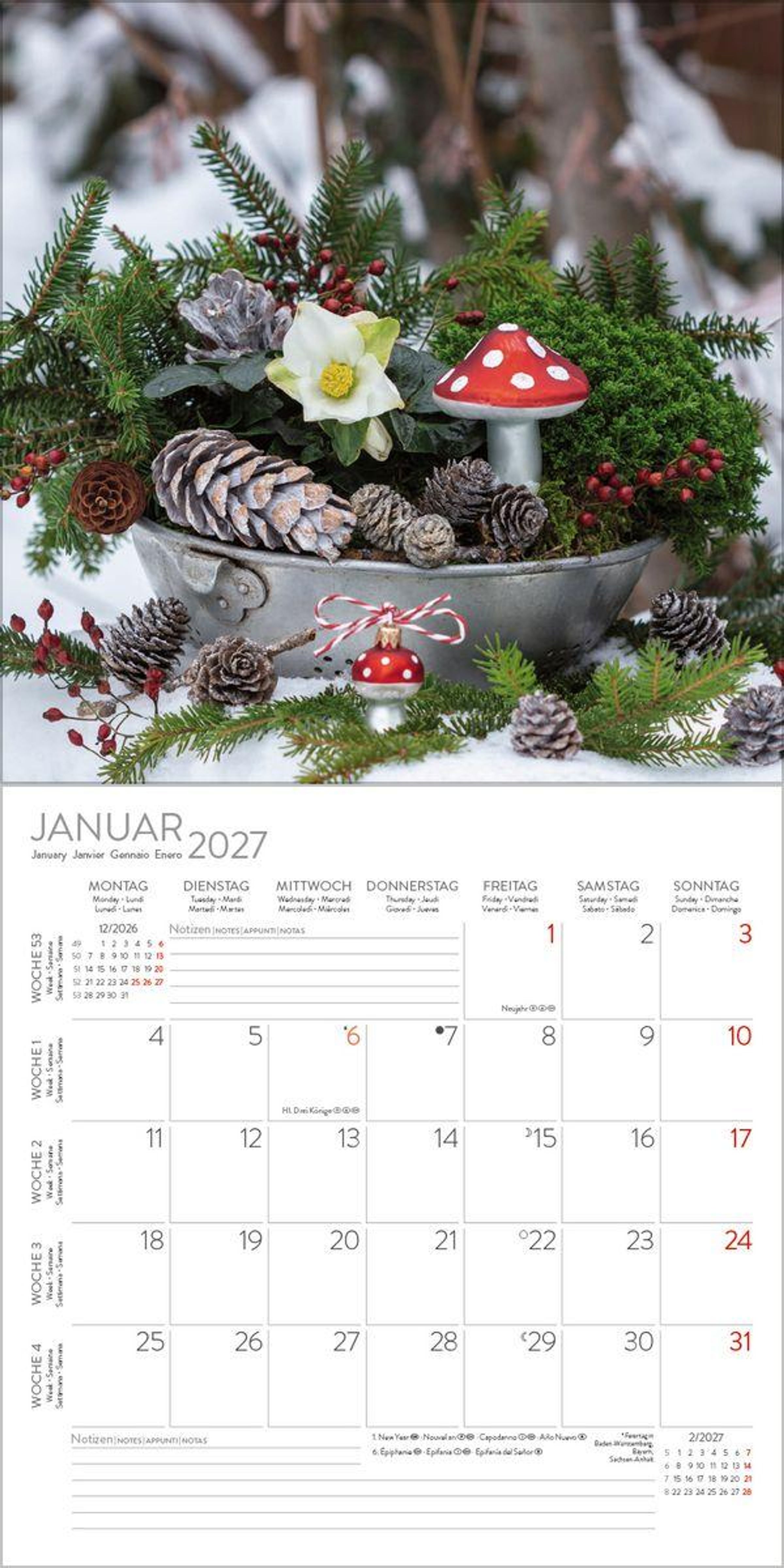 Wandkalender im Format: 30 x 30 cm; offenes Format: 30 x 60 cm; umweltfreundliches FSC Papier Jede Kalenderseite mit großem Bild und viel Platz im Kalendarium für Notizen und Termine Mehrsprachiges Kalendarium: DE/GB/FR/IT/ES mit Feiertagen für D/A/CH/GB/FR/IT/ES Regionale Ferienzeiten für DE/A/CH Monatsübersicht für den jeweiligen Vor- und Nachmonat; Jahresübersicht