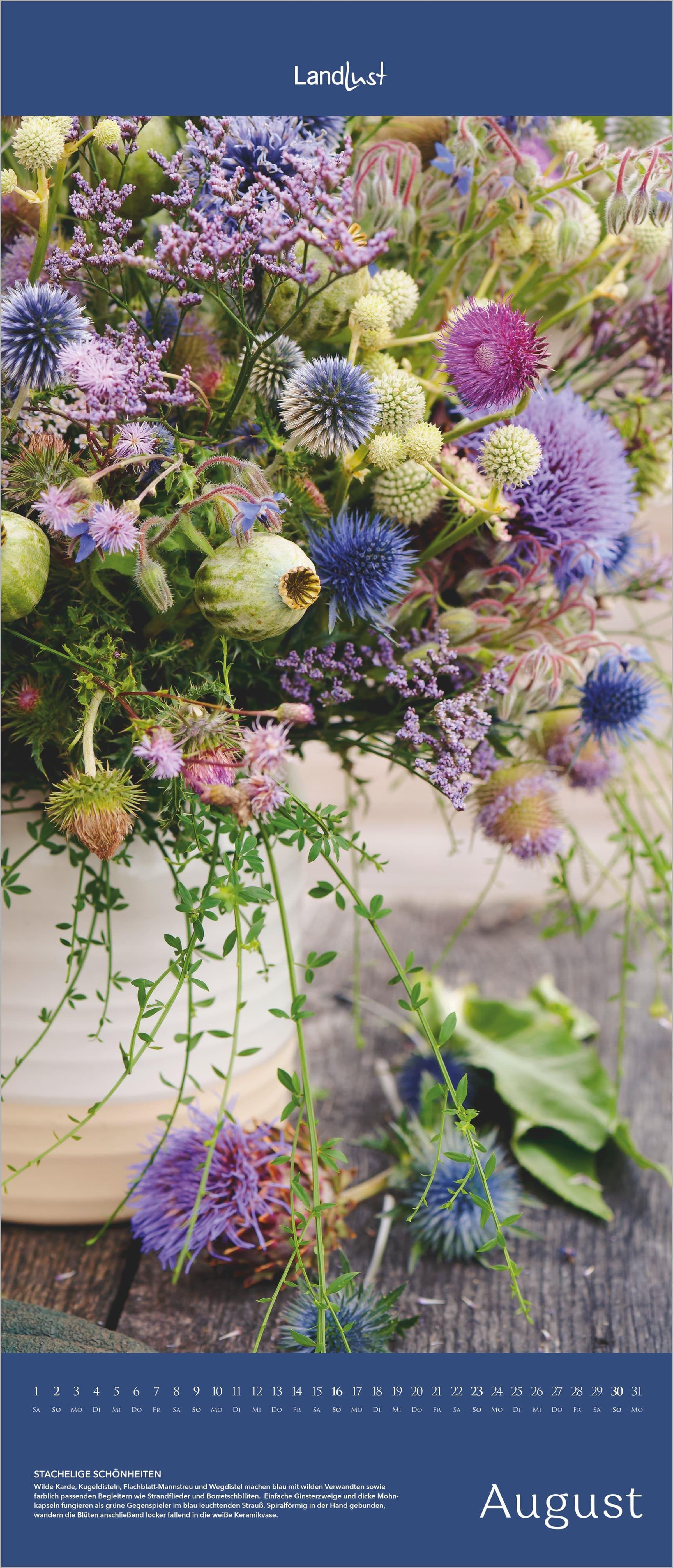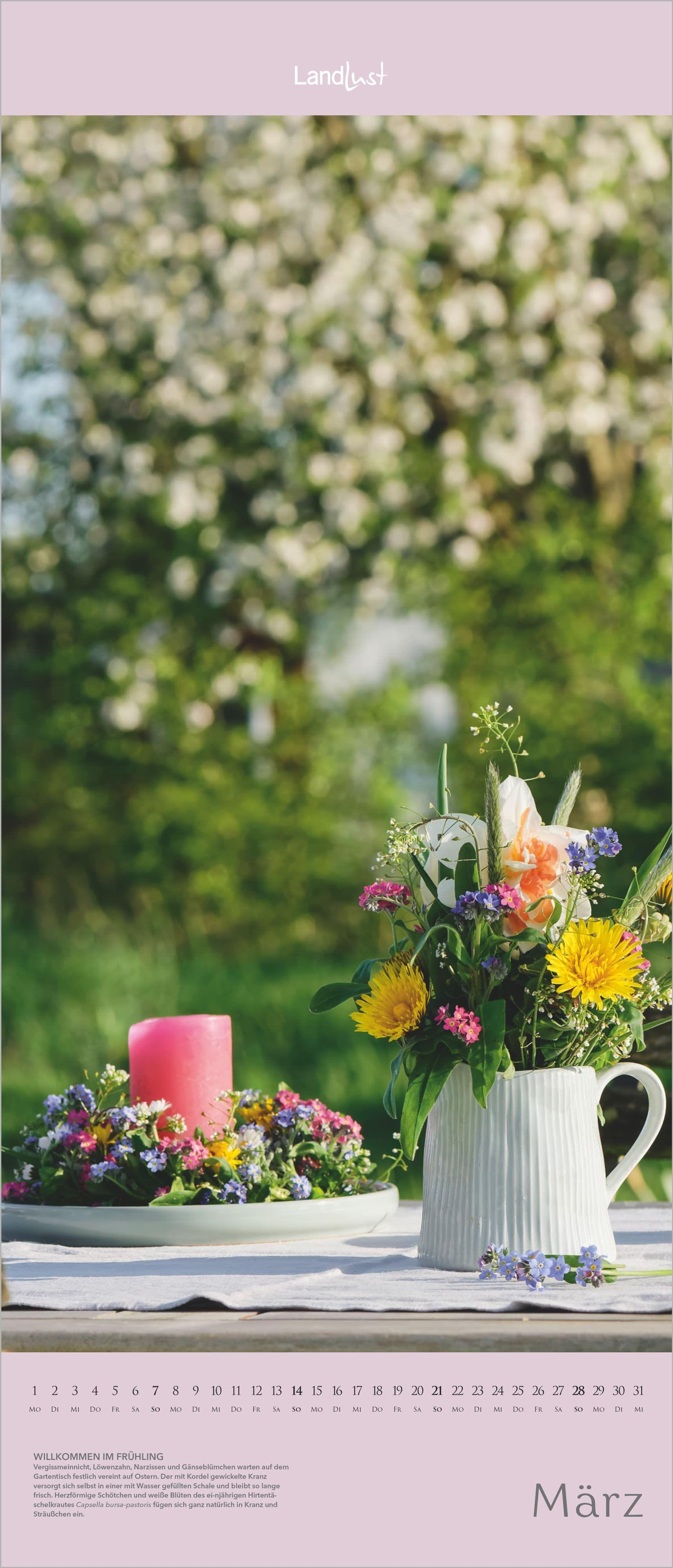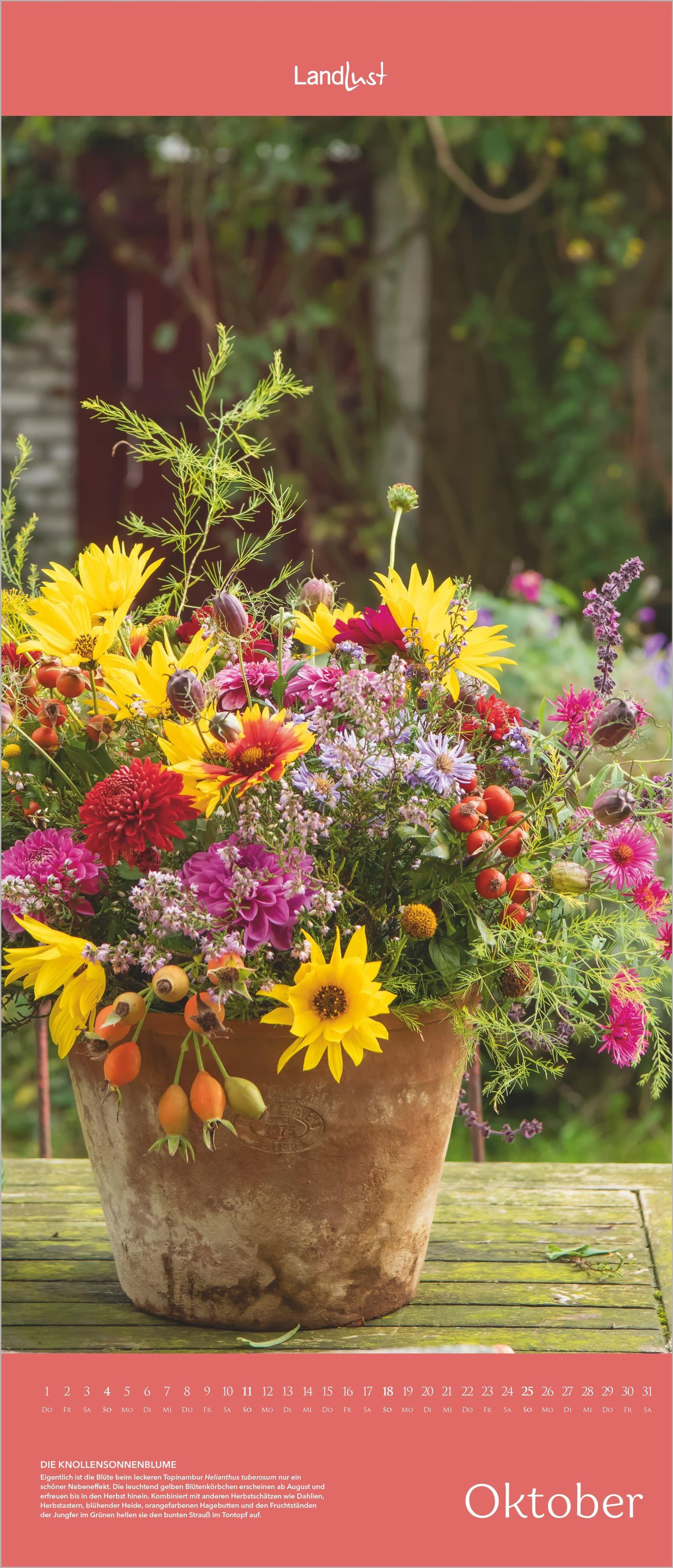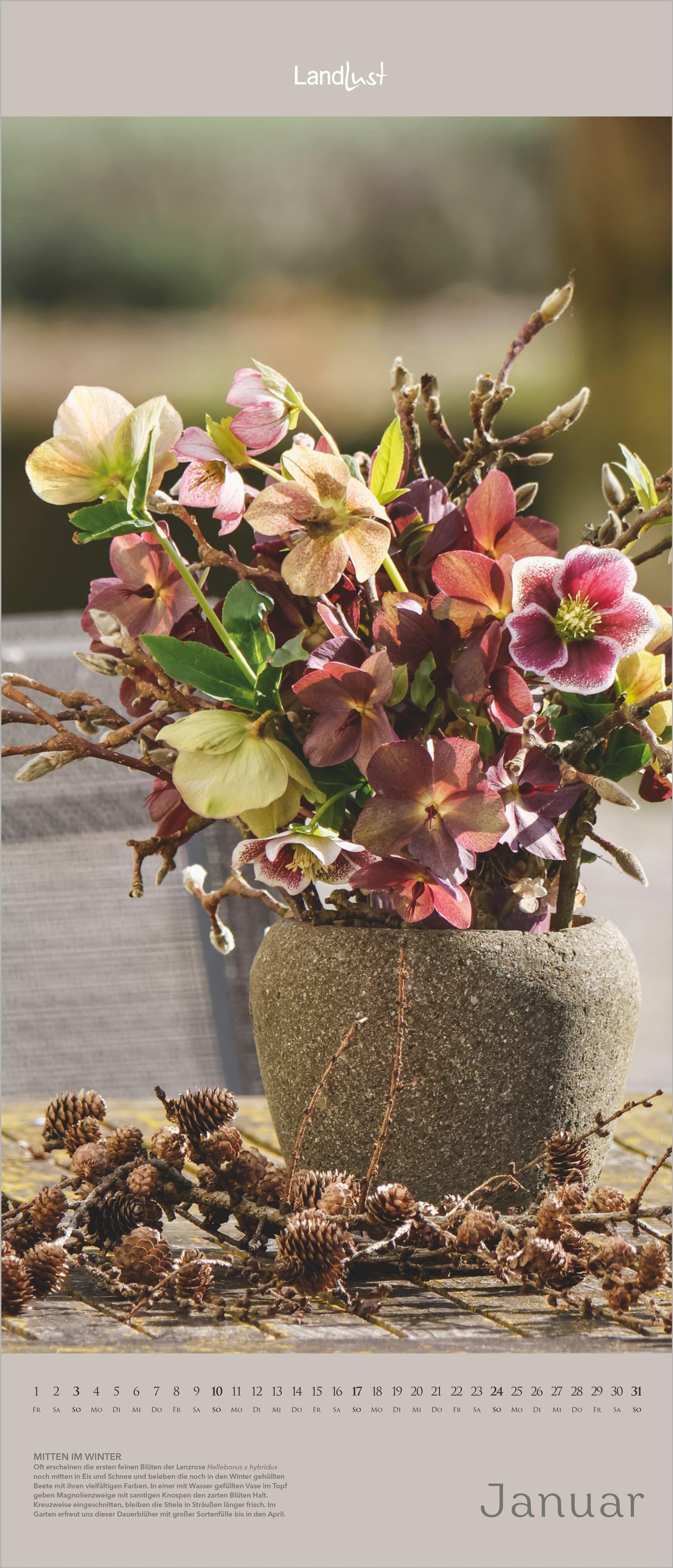 Jeden Monat ein neues Highlight -- von zarten Frühlingsblüten bis zu üppigen Sommerbouquets. Dieser stilvolle LandLust Vertikal-Kalender 2027 begeistert mit leuchtenden Farben, gestochen scharfer Fotografie und einem Format von 30×70 cm -- perfekt für schmale Wandflächen und Nischen.