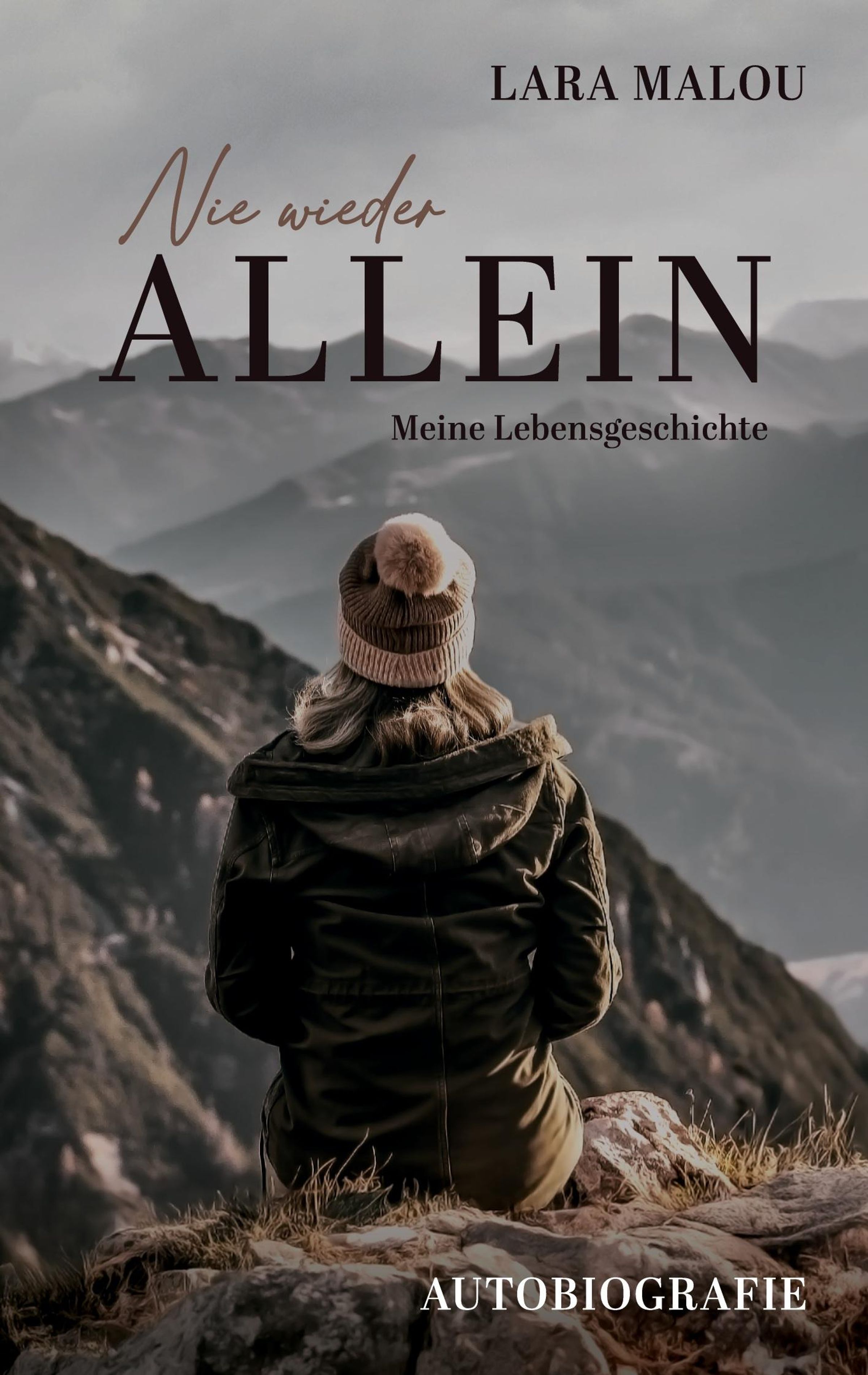 „Nie wieder allein: Meine Lebensgeschichte“ von Lara Malou. Eine Person sitzt mit Winterkleidung in den Bergen., Buch