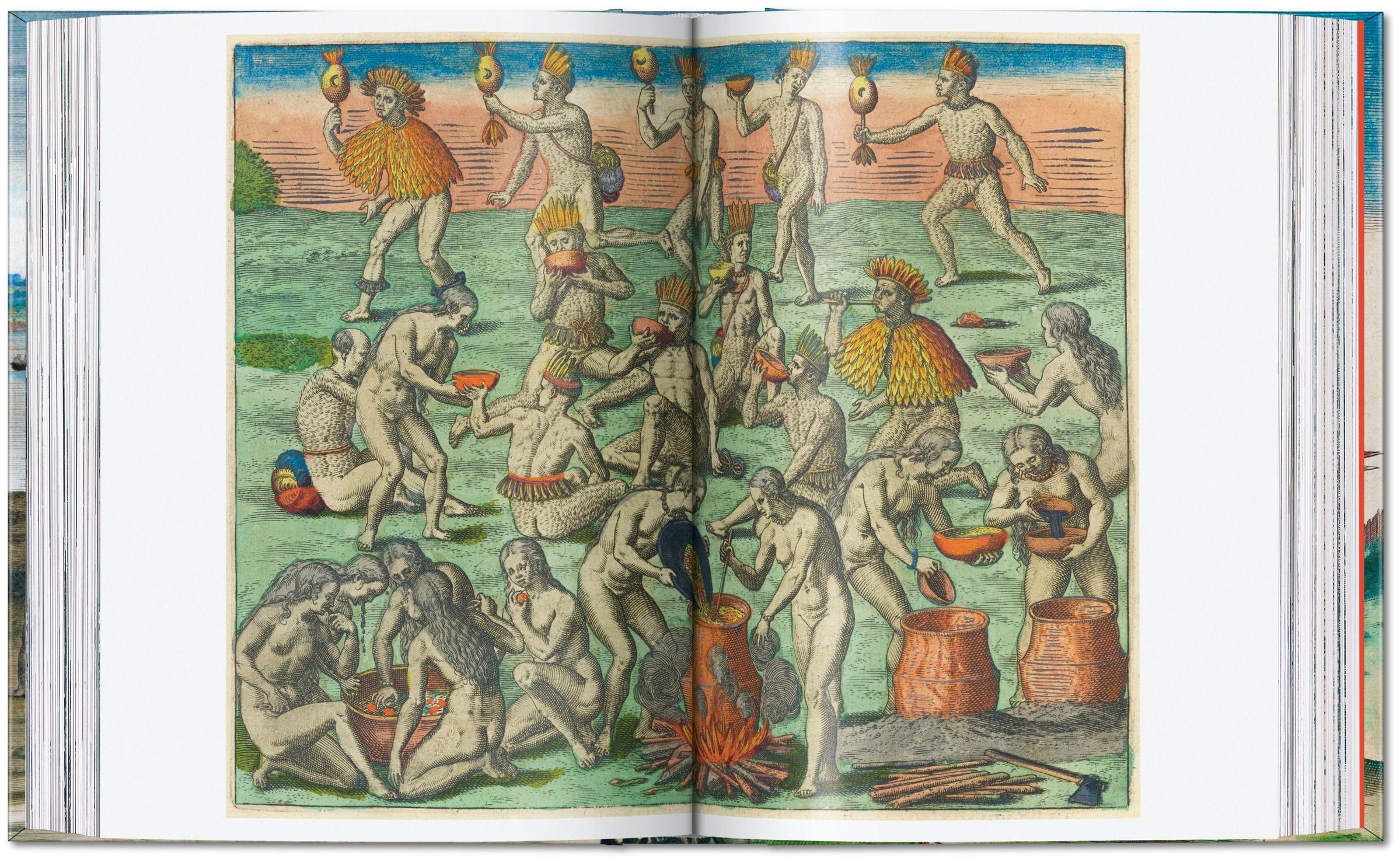 Von "Virginia" (dem heutigen North Carolina) und Florida, durch Zentralamerika bis hinunter nach Patagonien zeigen die ersten neun Bände von America Landschaften, fremdartiges Kulturinventar und erste Begegnungen zwischen indigener Bevölkerung und Europäern. TASCHENs Ausgabe zeigt alle 218 Bildtafeln dieser neun Bände mitsamt ihren jeweiligen Frontispizen und Karten. Die Bände I bis VI basieren auf den handkolorierten Originaldrucken, die in den John-Hay- und John-Carter-Brown-Bibliotheken an der Brown-Universität in Providence aufbewahrt werden; die Vorlagen für die Bände VII bis IX stammen aus der Staats- und Stadtbibliothek in Augsburg. Die Kupferstiche der de Brys mitsamt ihrer Bildlegenden sind Kunstwerke von außergewöhnlicher Qualität und in ihrer Komplexität auch heute noch spannend zu dechiffrierende Dokumente des frühen Kolonialdiskurses.