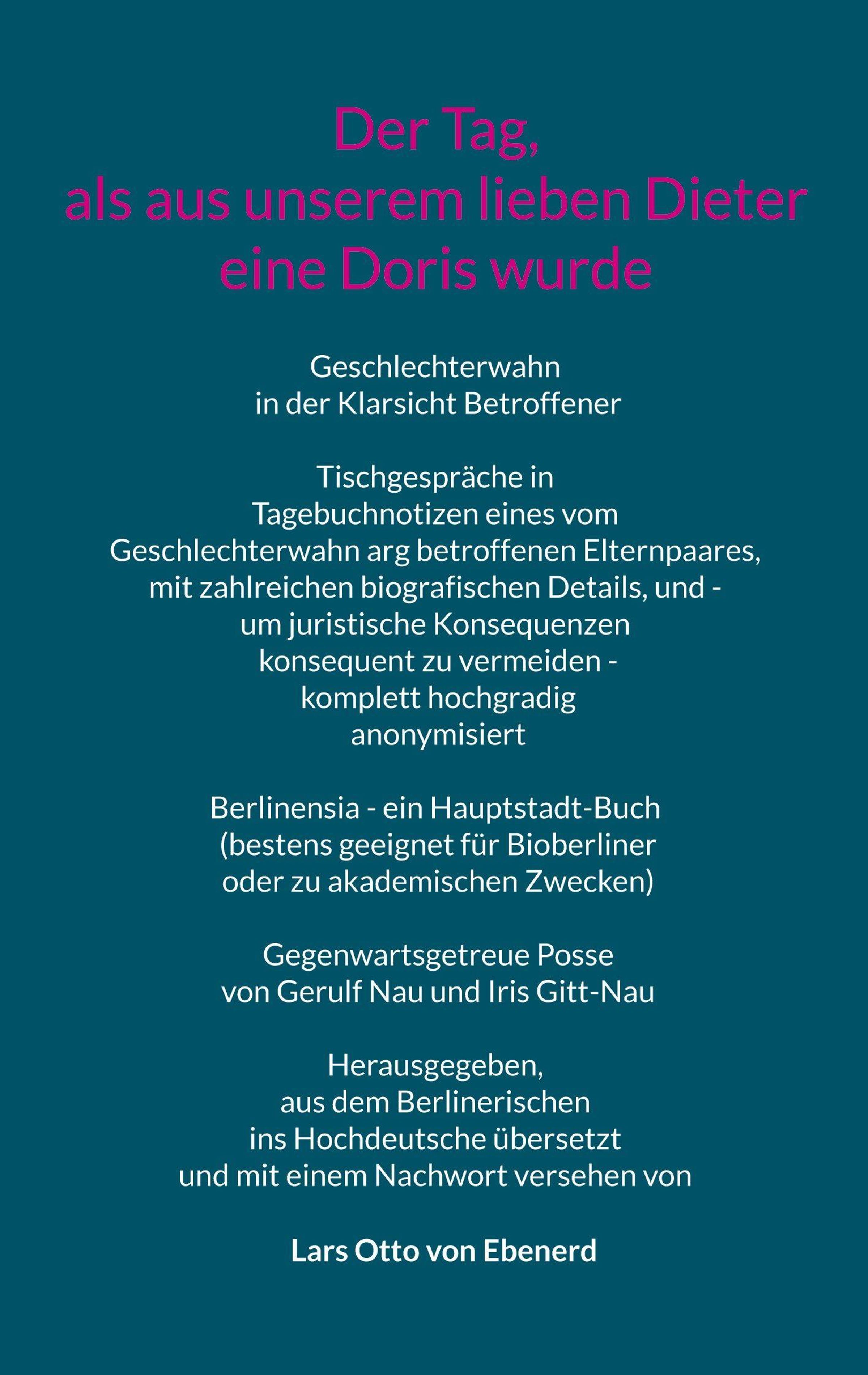 "Der Tag, als aus unserem Dieter eine Doris wurde" - dieses tragische Buch ist keine leichte Kost, es sei denn, du bist ein Bioberliner (oder wenigstens ein Akademiker). Geschildert werden Leiden und Nöte eines vom Geschlechterwahn grausam betroffenen Elternpaares. Tätige keinen Fehlkauf - bist du humorlos, dann ist dieses Buch nichts für dich, auch nichts für Betonköpfe, verbissene Zeitgeistfanatiker, warnt der Herausgeber Lars Otto von Ebenerd. Der Anfang seines Nachworts sei zur Orientierung hier zitiert: "Das Seelengemälde des Gerulf Nau, glasklar von ihm ausformuliert in zahlreichen nichtöffentlichen Tischgesprächen über eine längere Leidenszeit nun schon, über weite Strecken aus ihrem zuverlässigen Gedächtnis aufgezeichnet von einer Augen- und Ohrenzeugin, nämlich seiner allerliebsten Gattin Iris - ihr gebührt neben Gerulf selbst der Hauptdank für das Zustandekommen dieser vielsagenden Milieustudie. Das gemarterte Seelenbild des Gerulf, das dieser aus dem Herzen heraus und frisch von der Leber weg von sich gab, von Iris zuverlässig notiert und inhaltlich sogar aufpoliert in manch nebensächlichem Detail, der eine oder andere Punkt zudem ergänzt - die groben Konturen der Entstehungsgeschichte des Buches ... soll hier dem sehr kleinen Leserpublikum nicht vorenthalten werden. Iris ist doppelt zu danken, dass sie das Lokalcolorit nicht getilgt hat ... Als ich die Rohfassung in meinen adeligen Händen hielt konnte ich nicht meinem Namen entsprechend den Ball eher mal flach halten. Höchst begeistert war mir sofort klar: Dieses Buch muss das Licht der Öffentlichkeit erblicken, das ist meine heroische Ehrenpflicht von meinen Ahnen her, die auch tapfere Kämpfe ausgefochten haben zu ihren Zeiten! Denn: Wer viel lacht, der lebt länger - ist eines meiner aus jahrzehntelanger Lebenserfahrung gewonnenen Mottos ..." So weit der Beginn des bereits vielsagenden Nachworts von Lars Otto von Ebenerd (im Buch selbst diskret eingefügt hinter dem Text für Bioberliner und vor der zweifarbigen akademischen Fassung mit hochdeutscher Übersetzung). Möge diese biografische Studie nützlich sein einem jeden Leser, aufzupolieren seine persönliche Optik, so dass durch Zeitgeistvernebelungen hindurch Klarsicht entsteht. Möge das Buch einen Beitrag leisten, dass wieder offen und frei gesprochen werden kann über Randthemen, ein Beitrag zur Freiheit, die in einigen Themenfelder leider arg bedroht ist. Sollten wahre Einsichten gelingen, dann gebührt der Dank höherer Kraft.