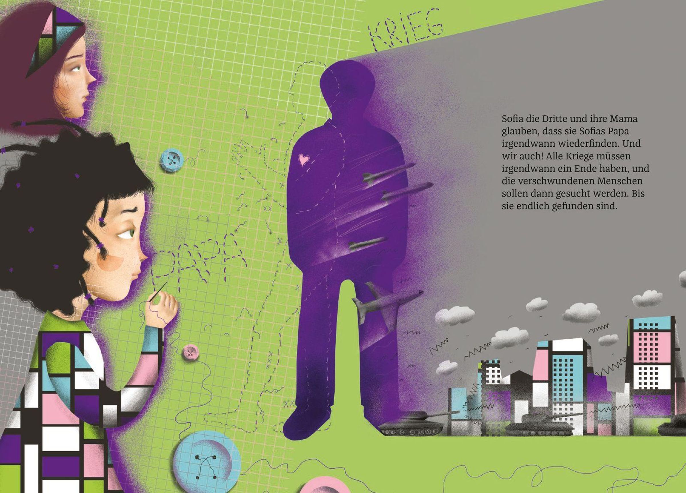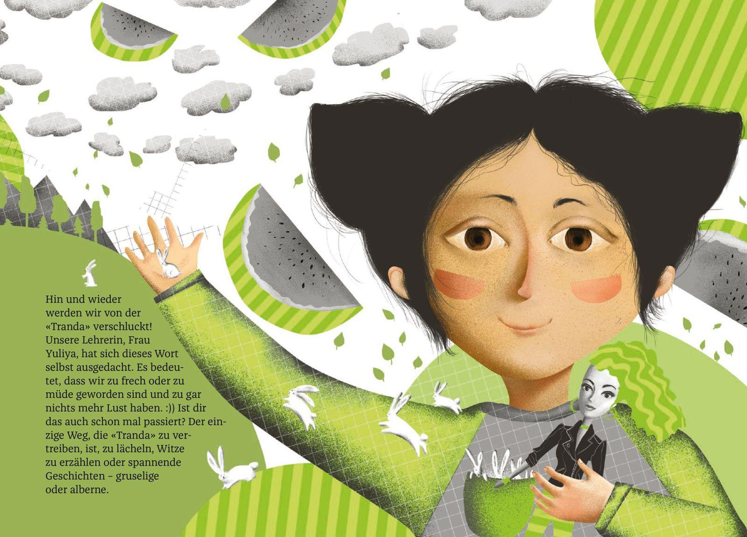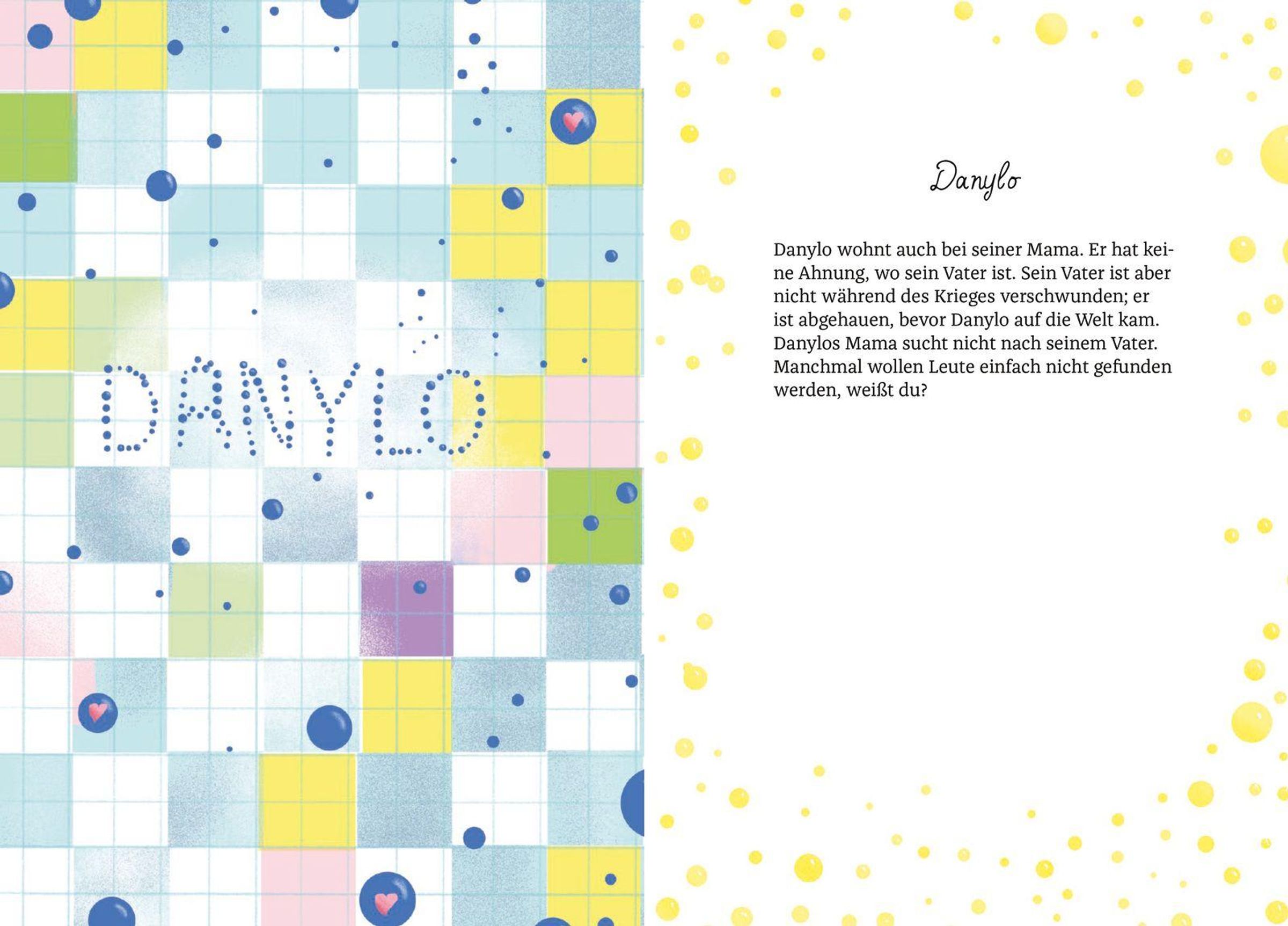 Da sind zum Beispiel Sophya und Solomia, zwei ganz besondere Zwillinge. Oder Tymko, der mal bei seiner Mama und mal bei seinem Papa wohnt. Oder Danylko, der seinen Vater gar nicht kennt. Oder Hrystyna, die bei ihrer Oma lebt, weil ihre Eltern im Ausland arbeiten. Oder Petro, der eine ganz riesige Familie hat. Ich selbst habe zwei Mamas. Und wie sieht deine Familie aus?