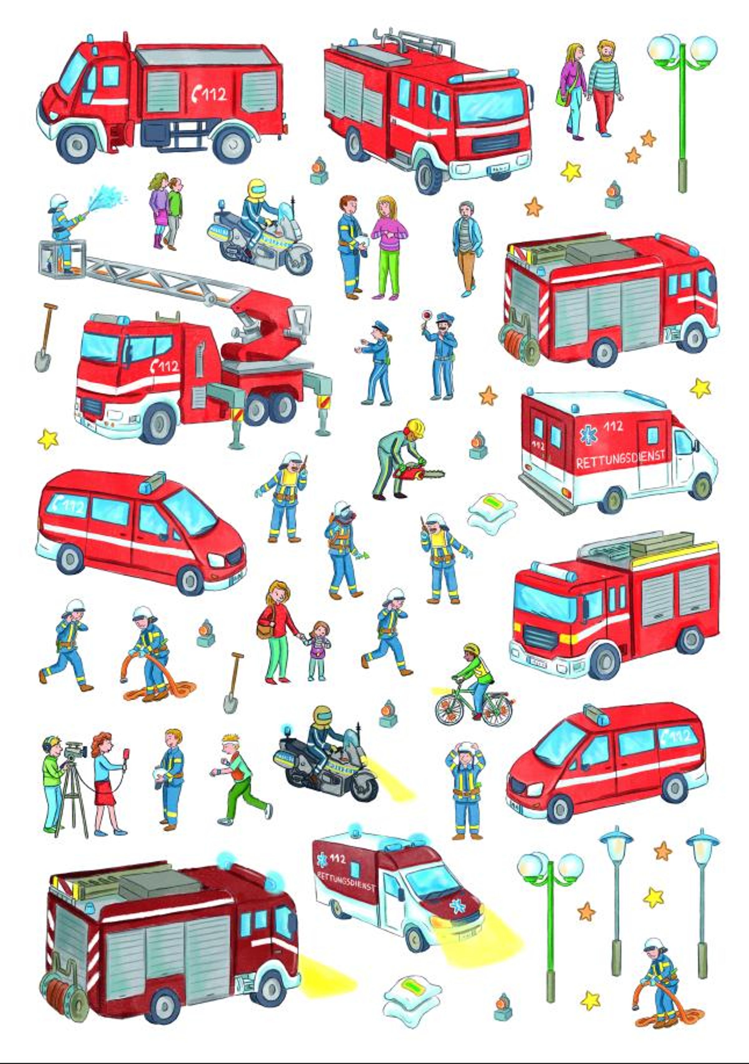 ¿ Auf 13 verschiedene Hintergründe von Straßen, Baustellen, Stadt- und Landszenen, Brandszenen und sonstige Notfallorte können die über 500 Sticker von Fahrzeugen und passenden Dekogegenständen wie Werkzeugen und Fehrkehrsschildern, aber auch Passanten und Einsatzkräften eingeklebt werden.