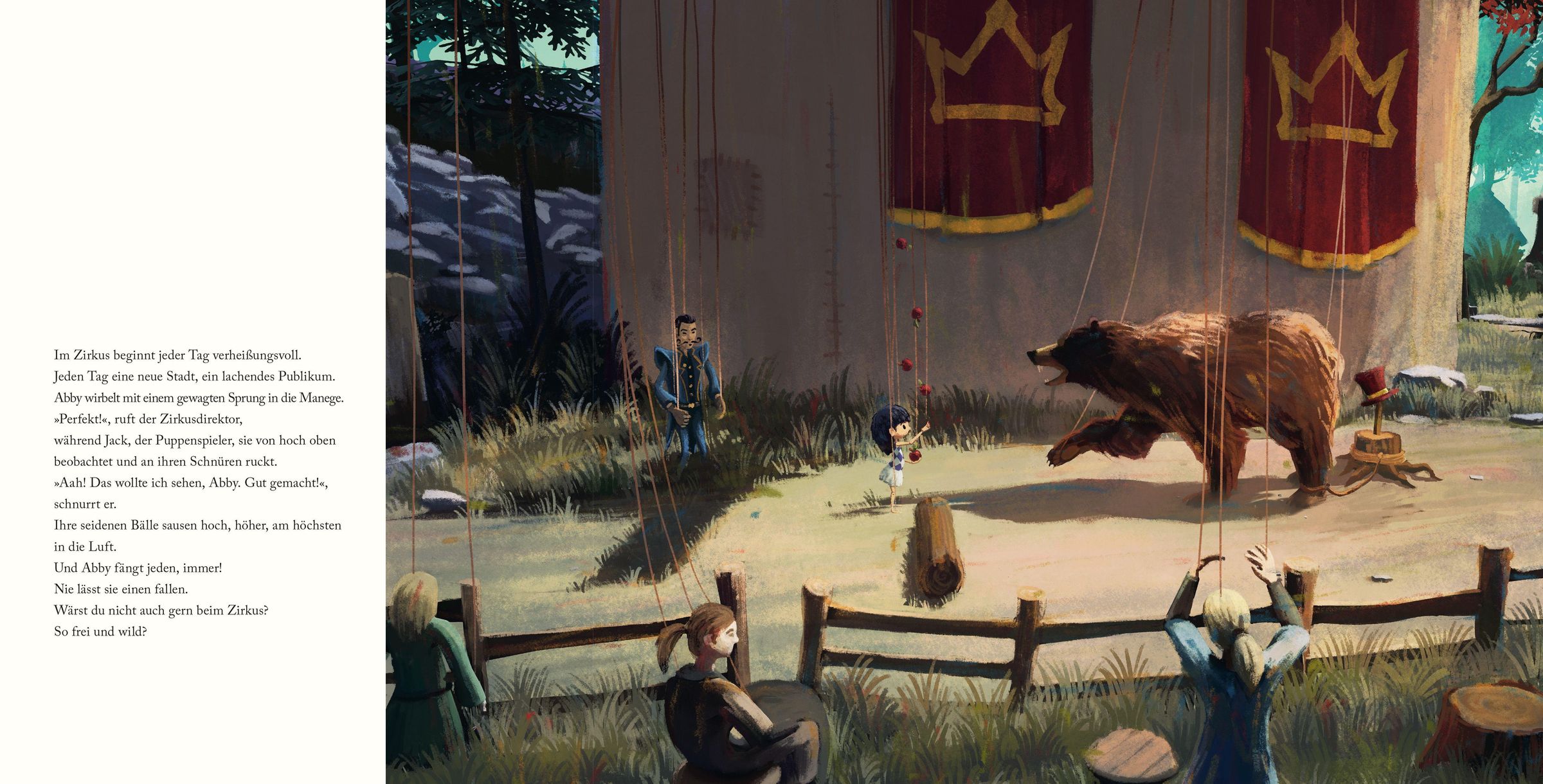 Abby ist Artistin in einem Zirkus, doch sie ist nicht frei. Der Puppenspieler Jack hält sie an Fäden, steuert jeden ihrer Schritte. Eines Tages bekommt sie die Chance zu fliehen - doch eine Macht hält sie immer noch fest. Sie erkundet die für sie neue, bunte Welt, versucht immer mehr, auf eigenen Beinen zu stehen. Schließlich erkennt sie, dass sie noch immer an Fäden hängt und sie erst richtig frei sein wird, wenn sie sich von ihnen löst ...