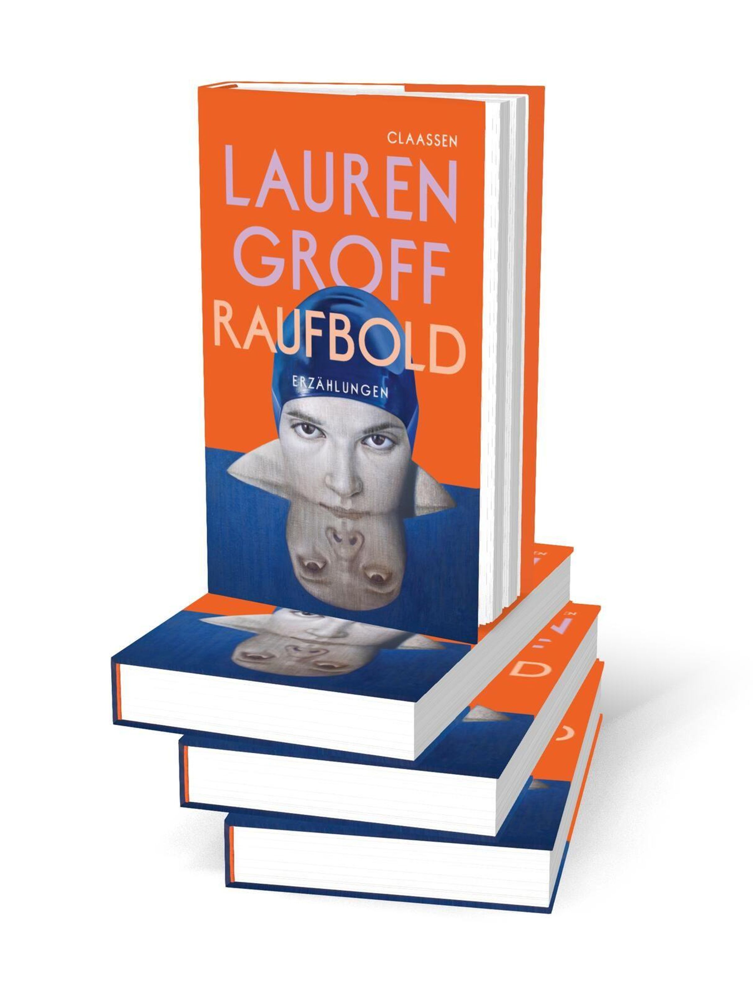 "Lauren Groff Raufbold Erzäh­lungen". Illustration: Gesicht mit blauer Badekappe, das sich im Wasser spiegelt., Buch
