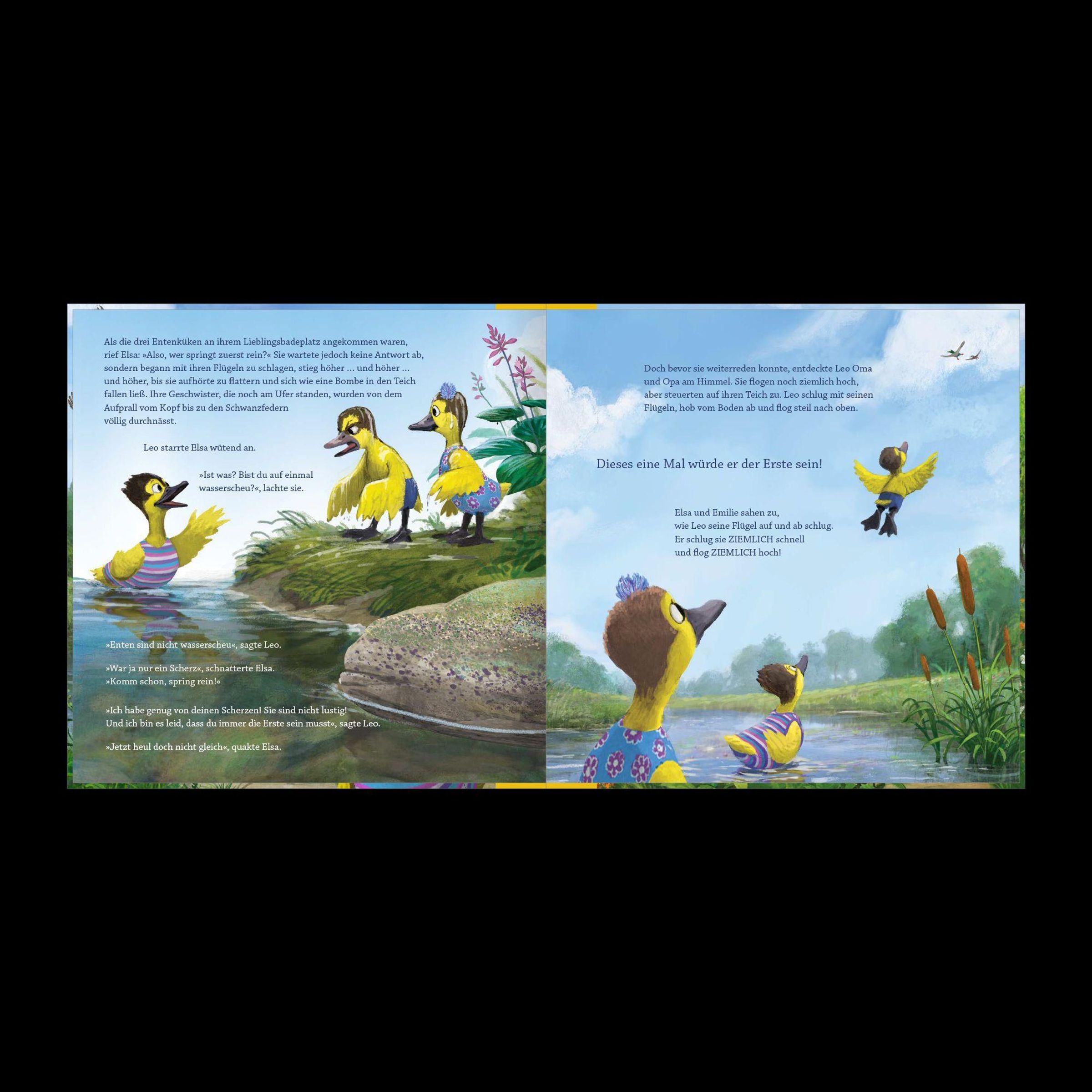 Elsa Ente ist ein paar Sekunden älter als ihre beiden Geschwister. Sie erwartet, dass sie damit immer und bei allem die Erste und Beste sein muss. So entsteht ein Wettstreit unter den Geschwistern, der zu ständigem Streit führt und fast in einer Katastrophe endet.