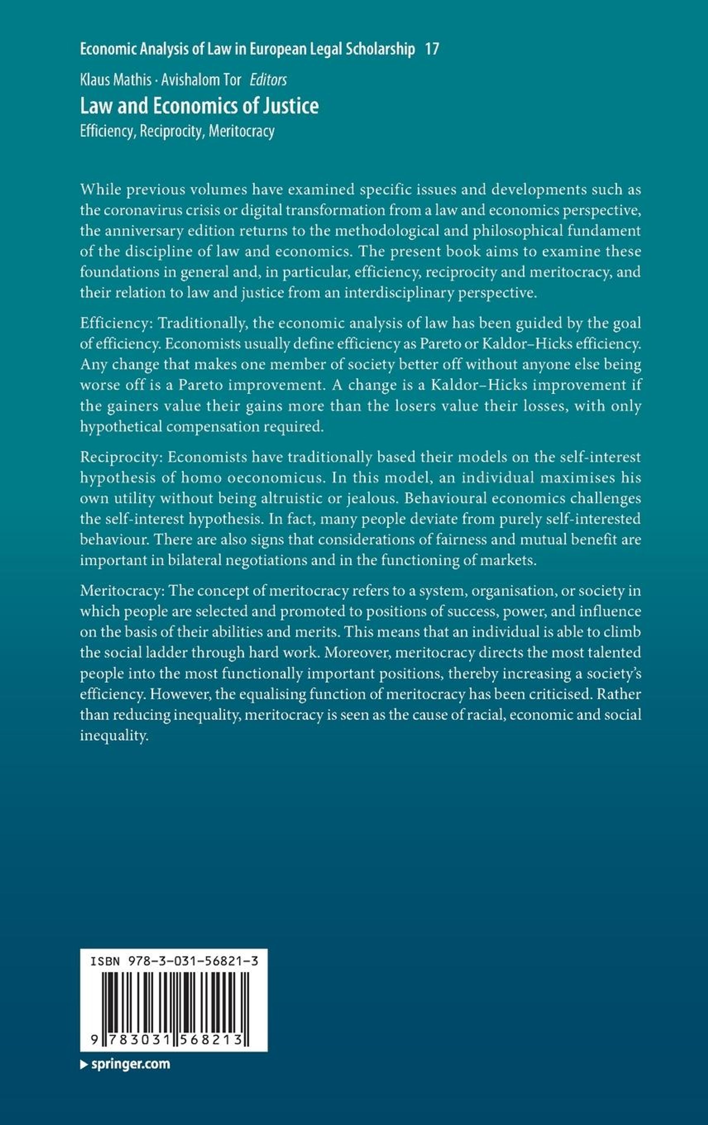 While previous volumes have examined specific issues and developments such as the coronavirus crisis or digital transformation from a law and economics perspective, the anniversary edition returns to the methodological and philosophical fundament of the discipline of law and economics. The present book aims to examine these foundations in general and, in particular, efficiency, reciprocity and meritocracy, and their relation to law and justice from an interdisciplinary perspective. Efficiency: Traditionally, the economic analysis of law has been guided by the goal of efficiency. Economists usually define efficiency as Pareto or Kaldor¿Hicks efficiency. Any change that makes one member of society better off without anyone else being worse off is a Pareto improvement. A change is a Kaldor¿Hicks improvement if the gainers value their gains more than the losers value their losses, with only hypothetical compensation required. Reciprocity: Economists have traditionally basedtheir models on the self-interest hypothesis of homo oeconomicus. In this model, an individual maximises his own utility without being altruistic or jealous. Behavioural economics challenges the self-interest hypothesis. In fact, many people deviate from purely self-interested behaviour. There are also signs that considerations of fairness and mutual benefit are important in bilateral negotiations and in the functioning of markets.