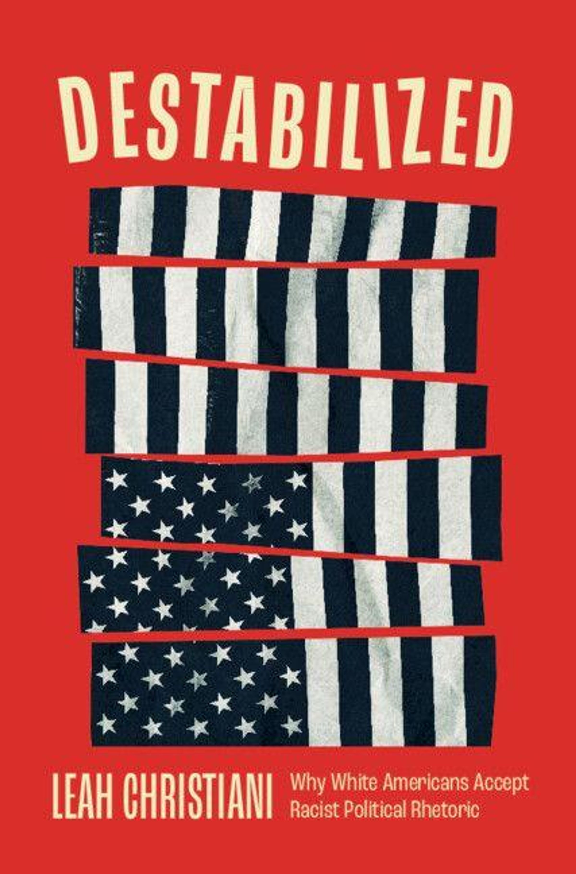 Text: "DESTABILIZED", "Leah Christiani", "Why White Americans Accept Racist Political Rhetoric". Zerlegte US-Flagge auf rotem Hintergrund., Buch