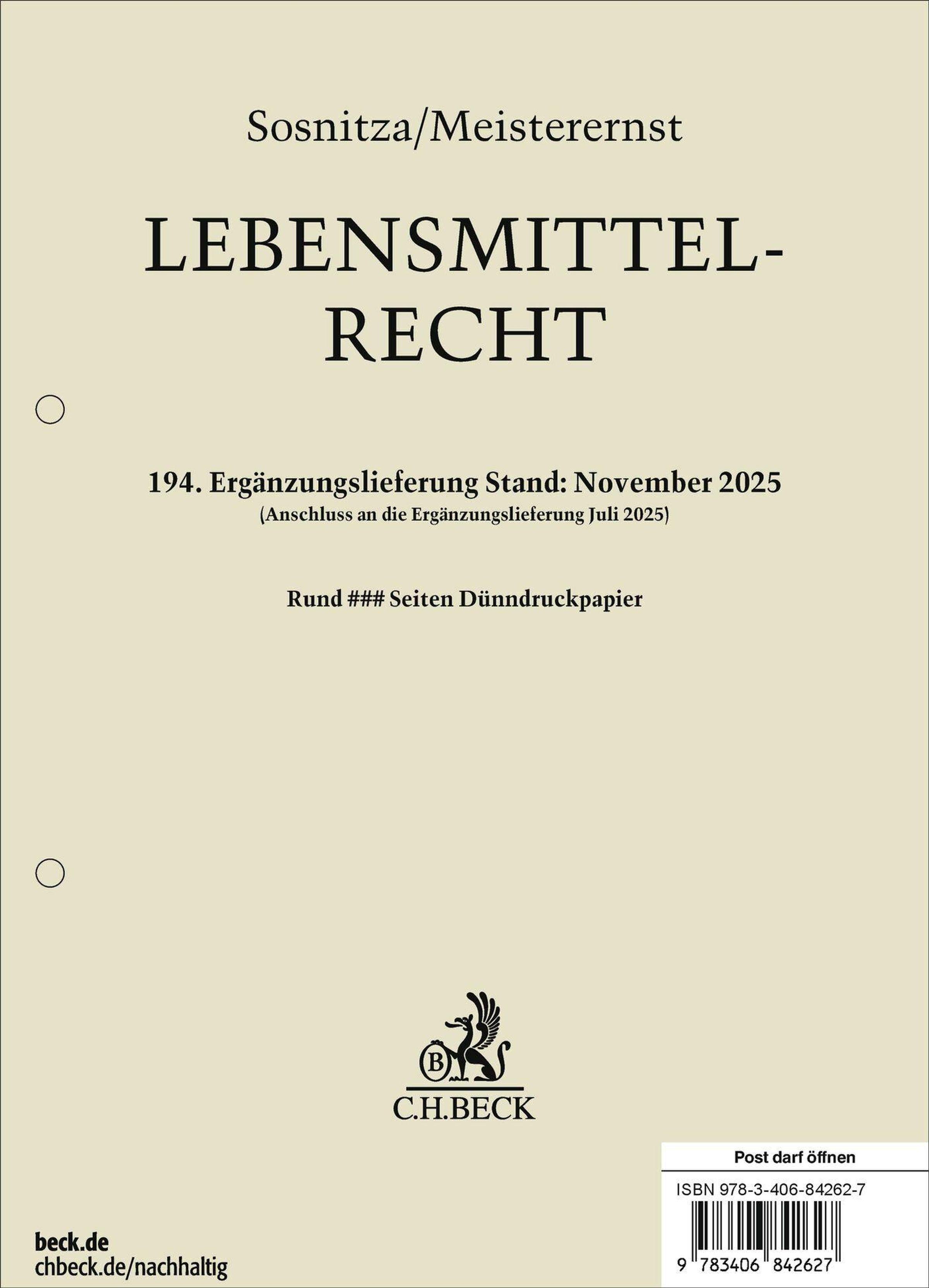 Sosnitza/Meisterernst. LEBENSMITTEL-RECHT. 194. Ergänzungslieferung November 2025. Logo von C.H.BECK., Buch