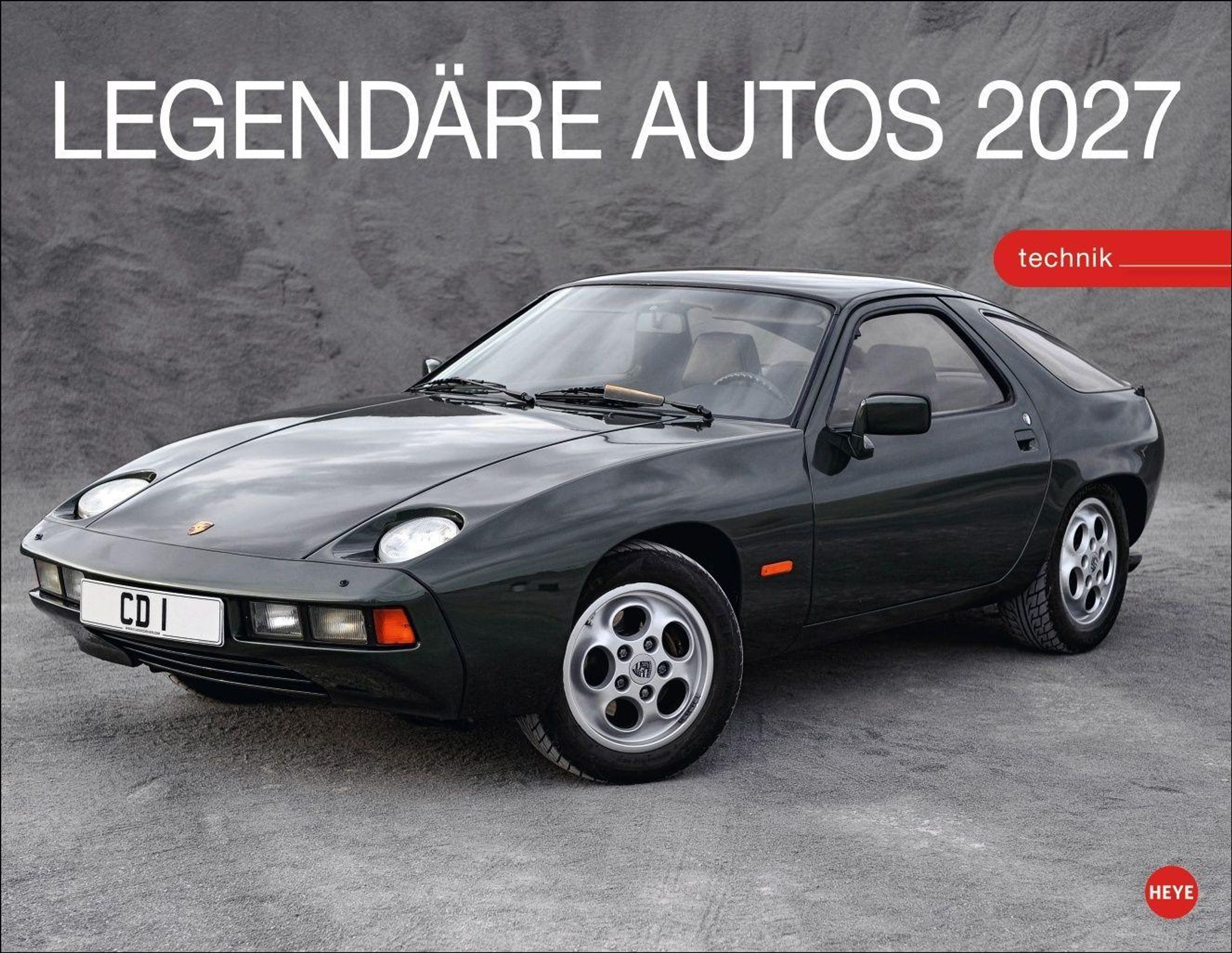 "LEGENDÄRE AUTOS 2027" oben, "technik" in rotem Rechteck. Auto: dunkler Sportwagen, elegantes Design., Kalender
