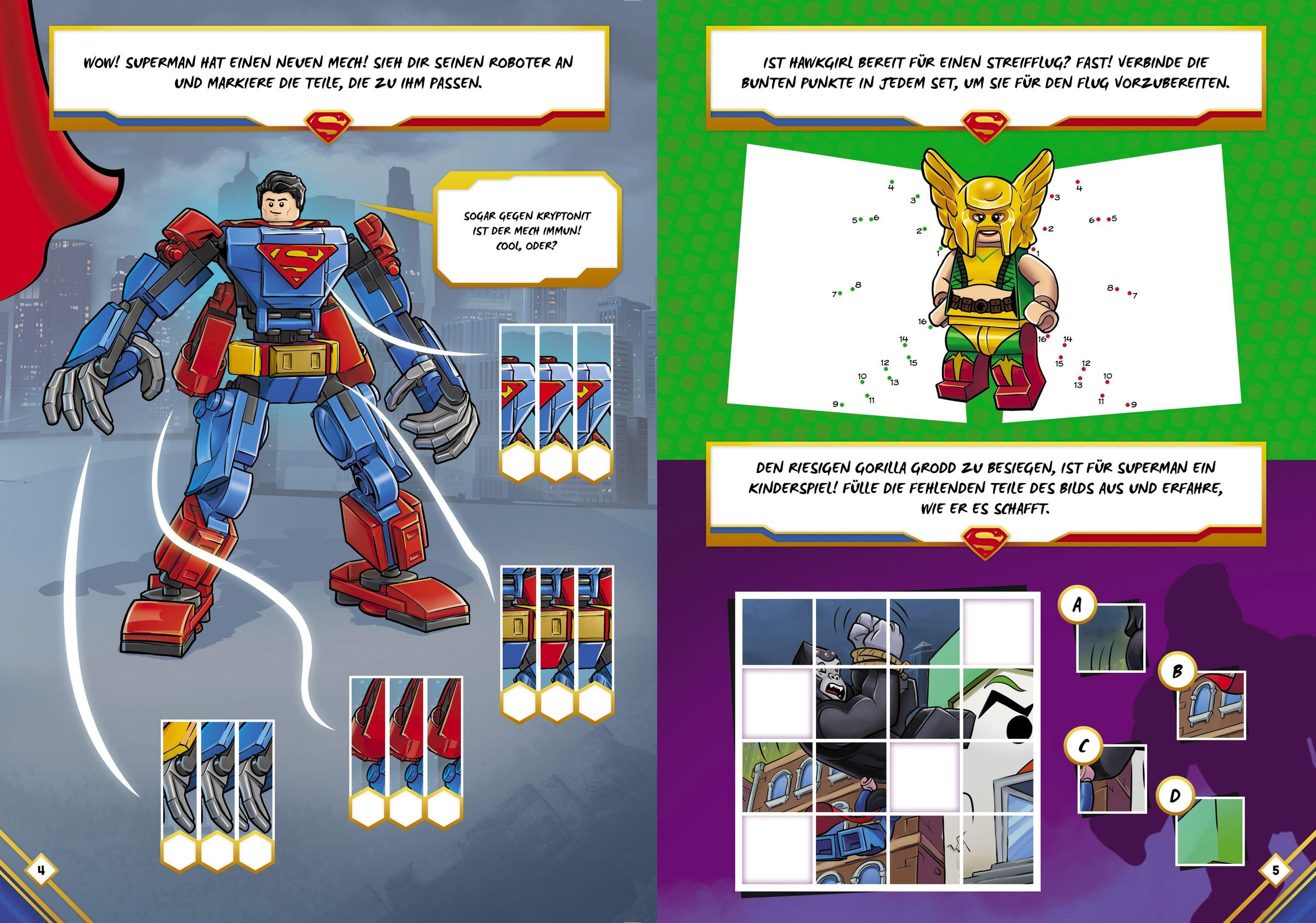"Rätselspaß mit Superman" und "Spiel! Rätsel! Geschichten!". LEGO-Superman-Figur und fliegende Superman-Illustration., Buch