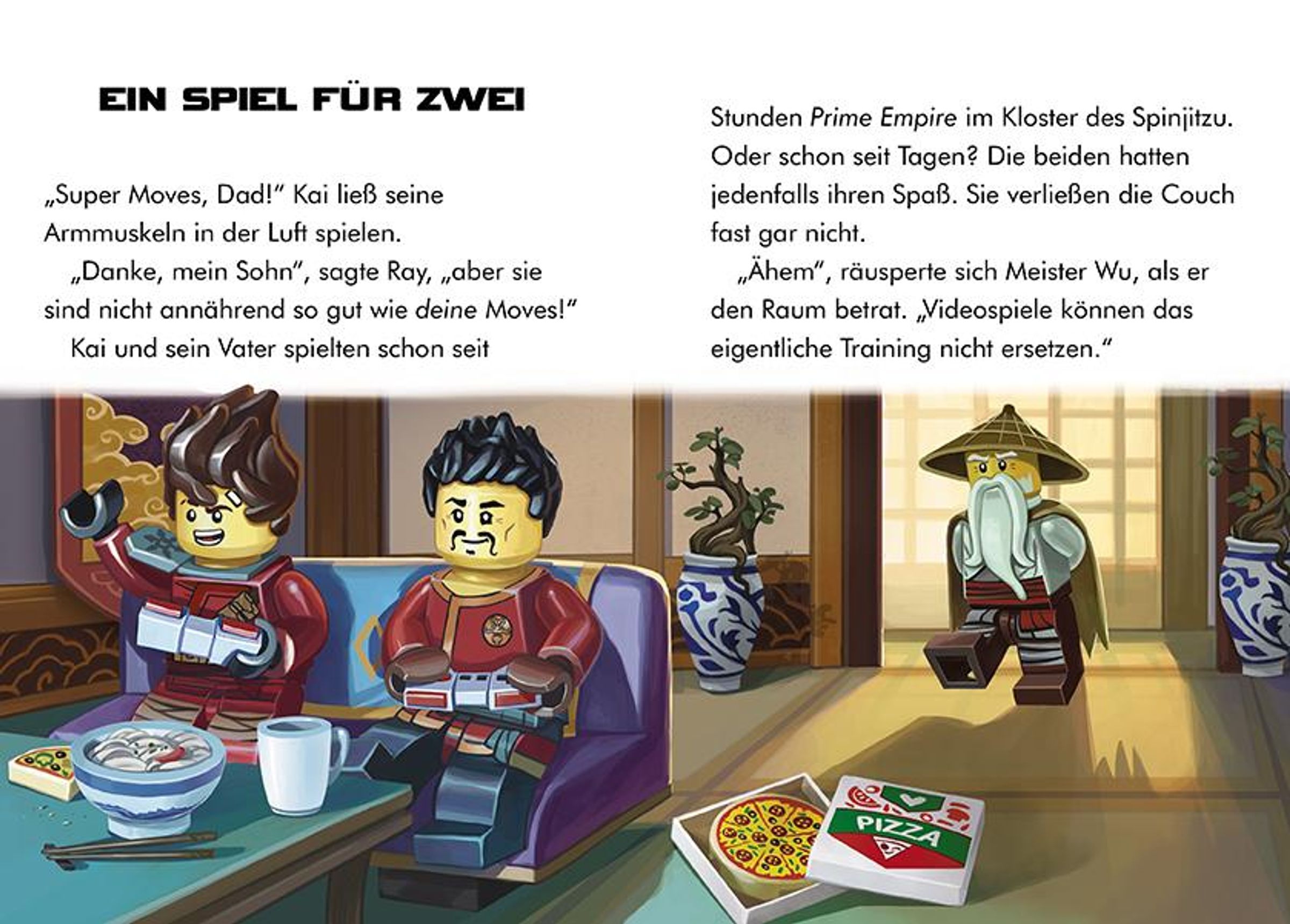 Meister Wu kann es kaum erwarten, die Fähigkeiten der Elementarmeister des Feuers zu studieren, aber Kai und sein Vater Ray, derzeitiger und ehemaliger Meister des Feuers, interessieren sich nur für ihr Videospiel. Wu setzt daher alles daran, die beiden von der Couch wegzubekommen, bis das Kloster plötzlich angegriffen wird...