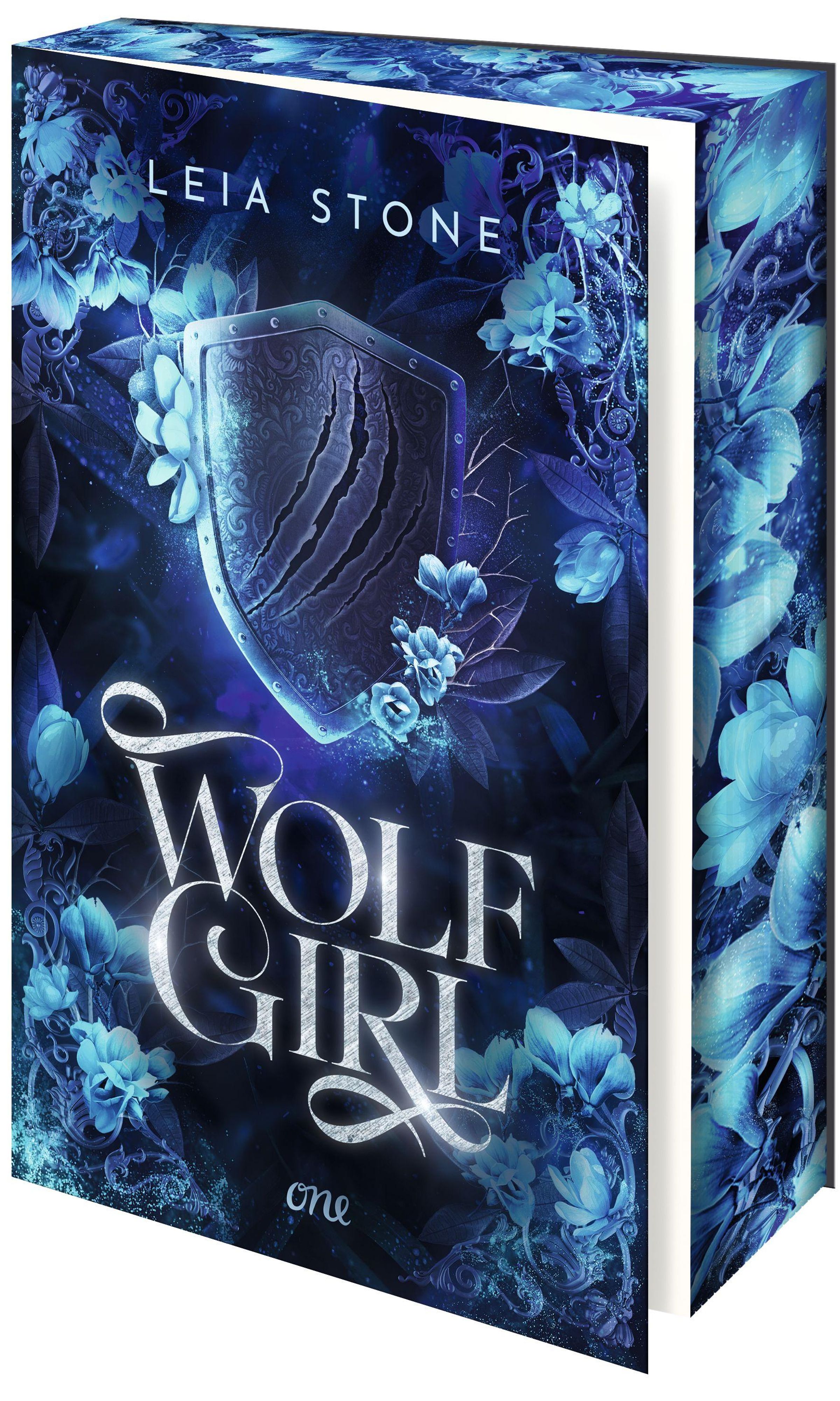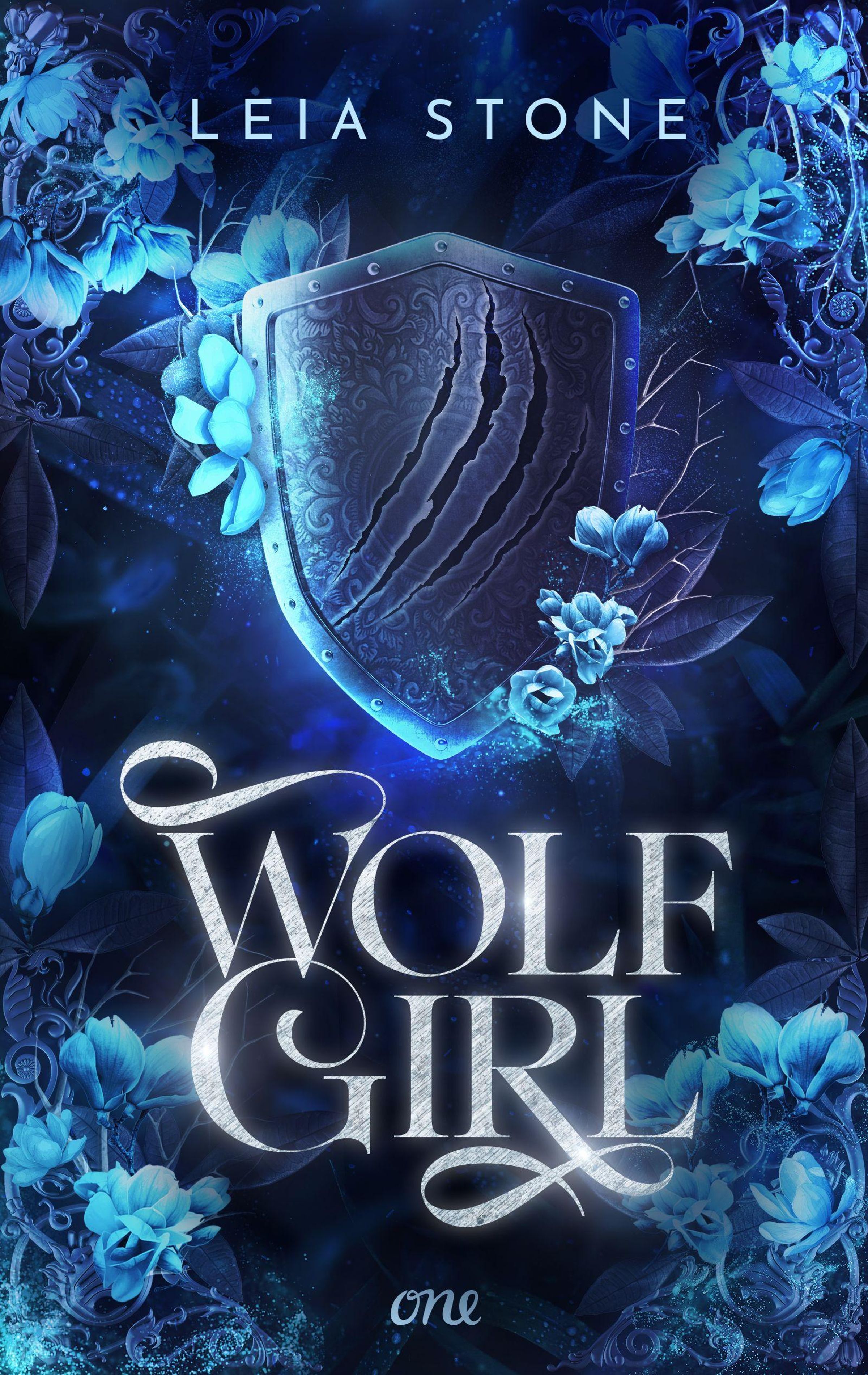 „Leia Stone. Wolf Girl. one.“ Ein blaues, florales Motiv mit einem Schild, eingekratzt mit Krallen., Buch