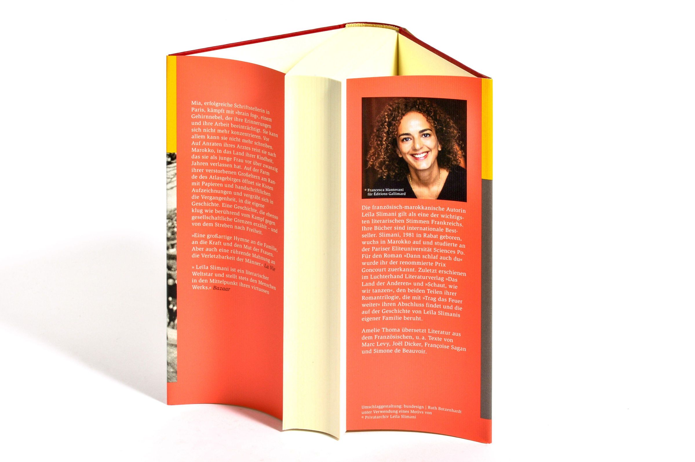 Die französisch-marokkanische Autorin Leïla Slimani gilt als eine der wichtigsten literarischen Stimmen Frankreichs. Slimani, 1981 in Rabat geboren, wuchs in Marokko auf und studierte an der Pariser Eliteuniversität Sciences Po. Ihre Bücher sind internationale Bestseller. Für den Roman »Dann schlaf auch du« wurde ihr der renommierte Prix Goncourt zuerkannt. »All das zu verlieren«, ebenfalls preisgekrönt, erscheint in 25 Ländern. »Das Land der Anderen« stand wochenlang auf Platz 1 der französischen Bestsellerliste. Der Roman basiert auf der Geschichte ihrer Großeltern. Leïla Slimani lebt mit ihrer Familie in Paris.Anmerkungen: