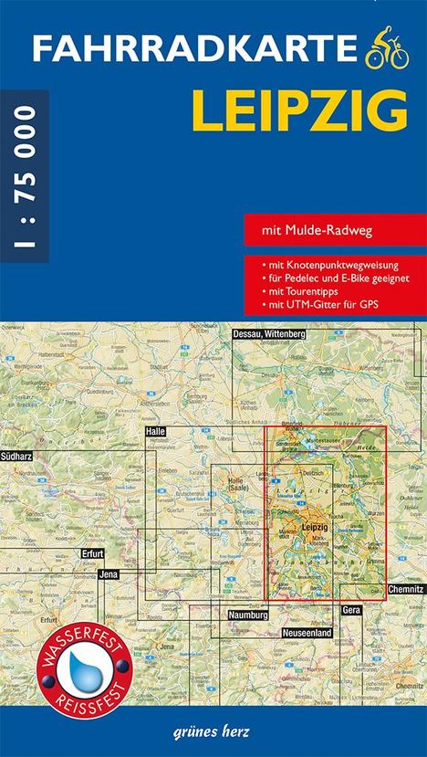 Die Fahrradkarte "Leipzig" wurde vom Verlag grünes herz in enger Zusammenarbeit mit den Ämtern sowie den Tourismusvereinen der Region und dem ADFC erarbeitet. Die Stadt Leipzig bildet mit dem Leipziger Neuseenland das Zentrum der in der Karte dargestellten Tourismusregion. Der Kartenausschnitt reicht von Bitterfeld Wolfen, mit dem Großen Goitzschesee, und Bad Schmiedeberg im Norden bis nach Borna und Colditz im Süden. Des weiteren von Schkeuditz und Markranstädt im Westen bis Grimma und Wurzen im Osten. Im Kartenbild finden sie auch solch touristisch interessante bzw. bedeutende Orte wie Delitzsch, Bad Düben, Eilenburg, Markkleeberg, Zwenkau, Pegau, Lucka und Bad Lausick wieder. Besonders hervorgehoben sind der Innere- und der Äußere Grüne Ring, die das Leipziger Umland den Radfahrern erschließen.