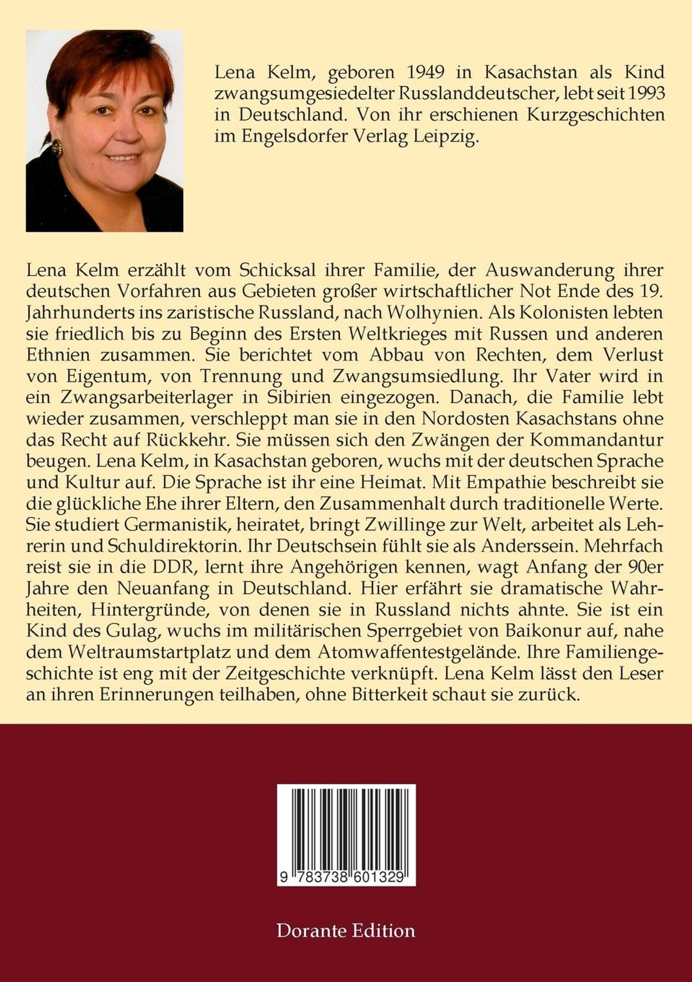 Lena Kelm erzählt vom Schicksal ihrer Familie, der Auswanderung ihrer deutschen Vorfahren aus Gebieten großer wirtschaftlicher Not Ende des 19. Jahrhunderts ins zaristische Russland, nach Wolhynien. Als Kolonisten lebten sie friedlich bis zu Beginn des Ersten Weltkrieges mit Russen und anderen Ethnien zusammen. Sie berichtet vom Abbau von Rechten, dem Verlust von Eigentum, von Trennung und Zwangsumsiedlung. Ihr Vater wird in ein Zwangsarbeiterlager in Sibirien eingezogen. Danach, die Familie lebt wieder zusammen, verschleppt man sie in den Nordosten Kasachstans ohne das Recht auf Rückkehr. Sie müssen sich den Zwängen der Kommandantur beugen. Lena Kelm, in Kasachstan geboren, wuchs mit der deutschen Sprache und Kultur auf. Die Sprache ist ihr eine Heimat. Mit Empathie beschreibt sie die glückliche Ehe ihrer Eltern, den Zusammenhalt durch traditionelle Werte. Sie studiert Germanistik, heiratet, bringt Zwillinge zur Welt, arbeitet als Lehrerin und Schuldirektorin. Ihr Deutschsein fühlt sie als Anderssein. Mehrfach reist sie in die DDR, lernt ihre Angehörigen kennen, wagt Anfang der 90er Jahre den Neuanfang in Deutschland. Hier erfährt sie dramatische Wahrheiten, Hintergründe, von denen sie in Russland nichts ahnte. Sie ist ein Kind des Gulag, wuchs im militärischen Sperrgebiet von Baikonur auf, nahe dem Weltraumstartplatz und dem Atomwaffentestgelände. Ihre Familiengeschichte ist eng mit der Zeitgeschichte verknüpft. Lena Kelm lässt den Leser an ihren Erinnerungen teilhaben, ohne Bitterkeit schaut sie zurück.
