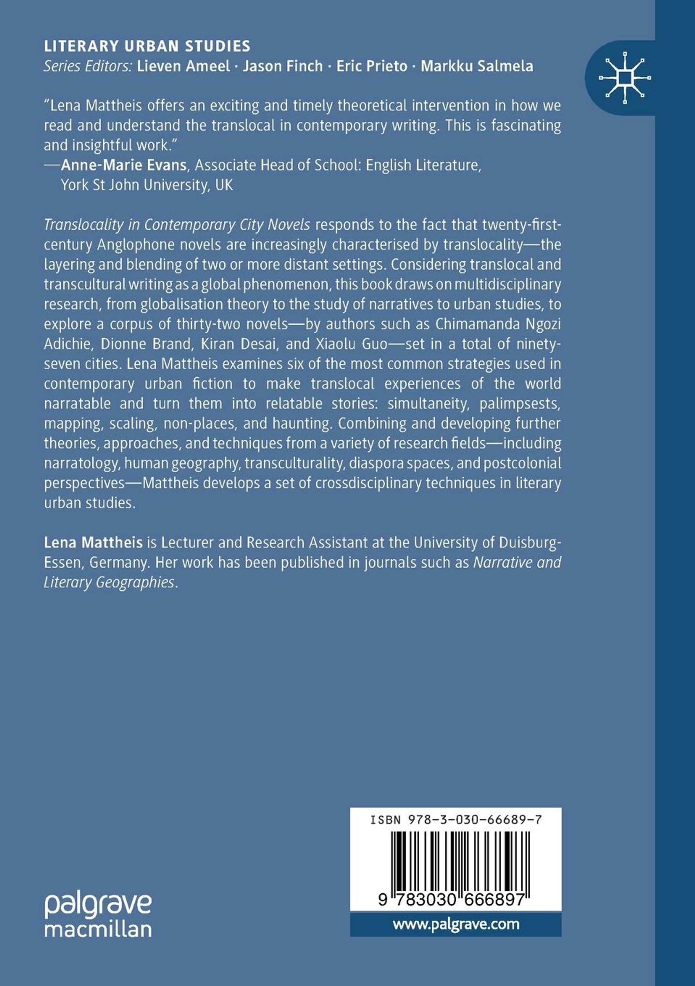 Translocality in Contemporary City Novels responds to the fact that twenty-first-century Anglophone novels are increasingly characterised by translocality¿the layering and blending of two or more distant settings. Considering translocal and transcultural writing as a global phenomenon, this book draws on multidisciplinary research, from globalisation theory to the study of narratives to urban studies, to explore a corpus of thirty-two novels¿by authors such as Chimamanda Ngozi Adichie, Dionne Brand, Kiran Desai, and Xiaolu Guöset in a total of ninety-seven cities. Lena Mattheis examines six of the most common strategies used in contemporary urban fiction to make translocal experiences of the world narratable and turn them into relatable stories: simultaneity, palimpsests, mapping, scaling, non-places, and haunting. Combining and developing further theories, approaches, and techniques from a variety of research fields¿including narratology, human geography, transculturality, diaspora spaces, and postcolonial perspectives¿Mattheis develops a set of cross-disciplinary techniques in literary urban studies.