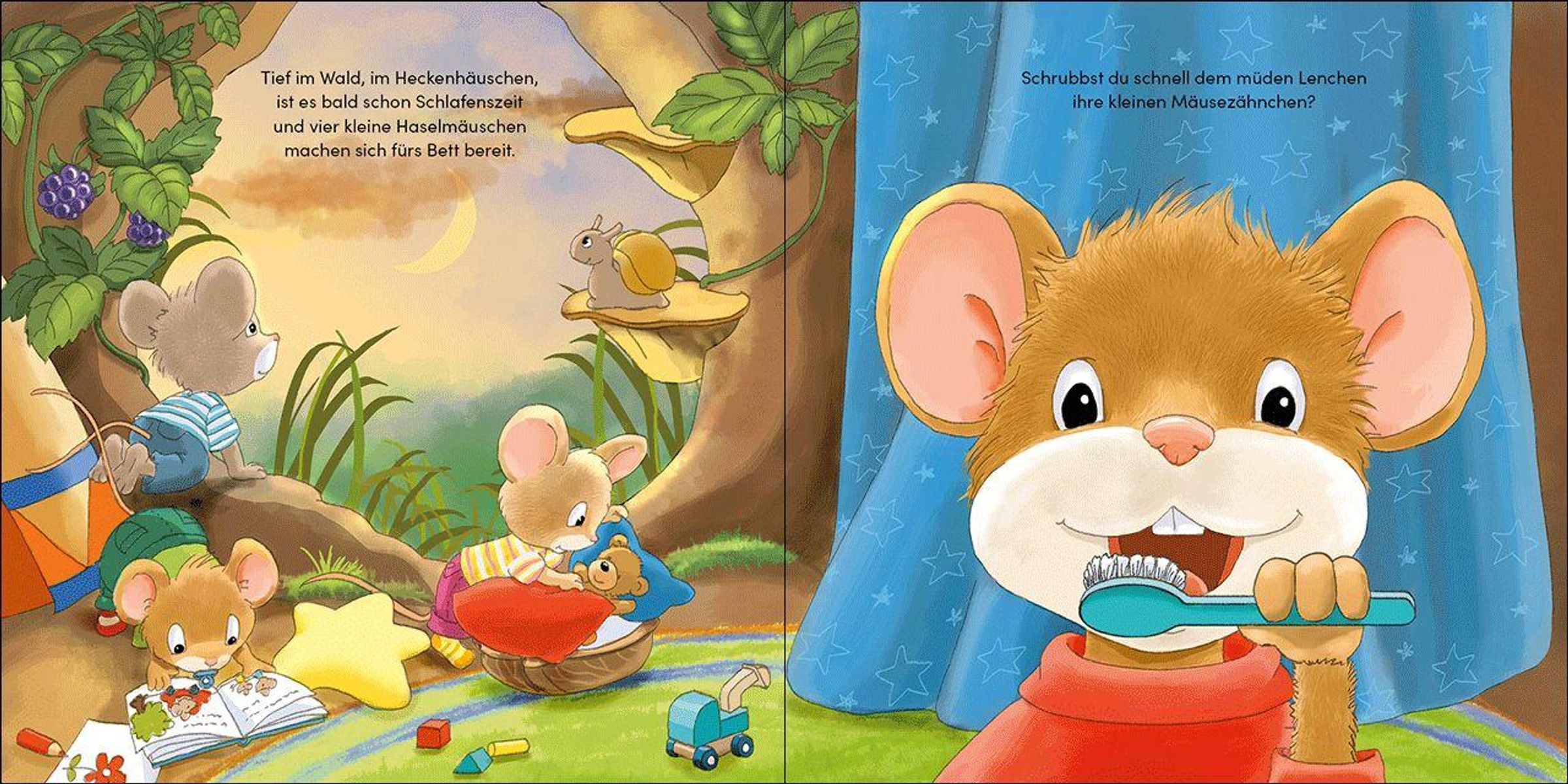 In der alten Brombeerhecke, hier im warmen Kugelhaus, wartet schon die Kuscheldecke auf Familie Haselmaus. Deckst du noch die Mäuschen zu? Schau, dann schlafen sie im Nu.